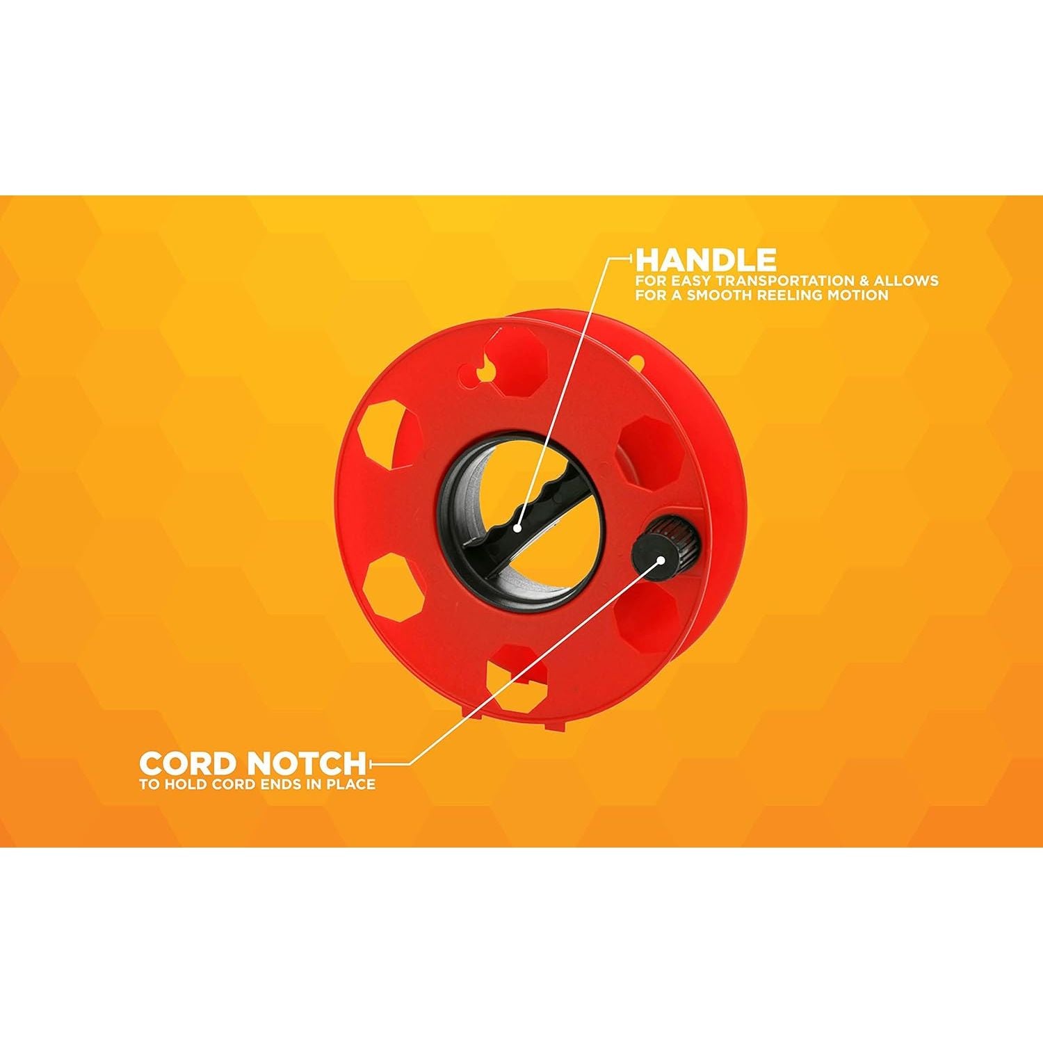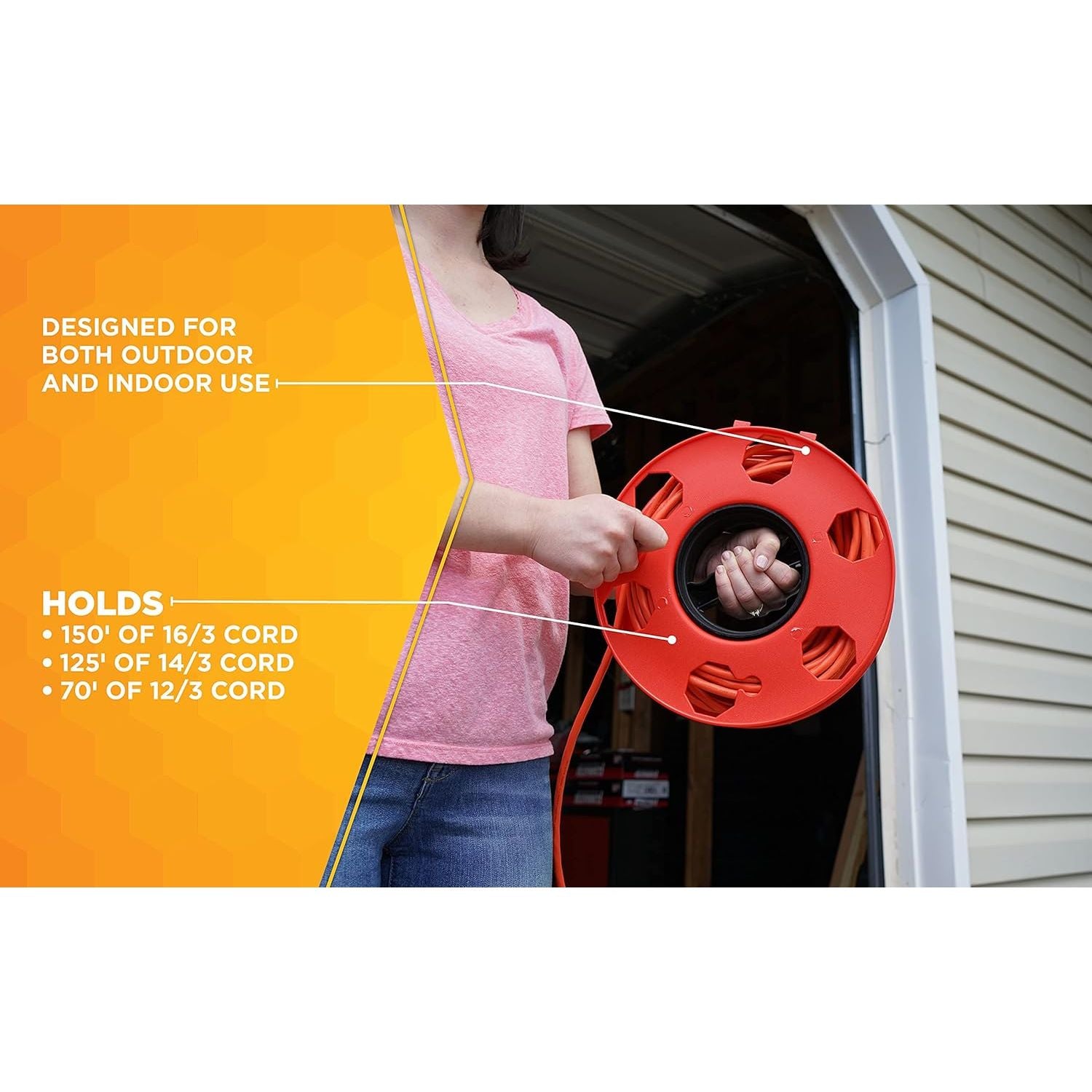 - Tangle-Free Cord Storage Reel: The Woods Cord Storage reel holds up to 150-feet of 16/3 gauge cord or 125-feet of 14/3 gauge cord; features a lightweight frame, storage hook, and easy grip cord wheel for fast winding