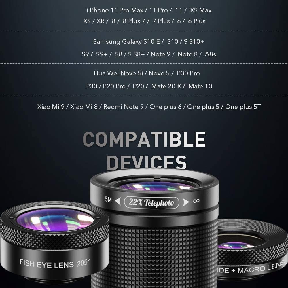 - APEXEL 6 in 1 Phone Lens Kit - 22X Telephoto Lens, 205° Fisheye Lens, 120° Wide Angle Lens & 25X Macro Lens(Screwed Together), Compatible with iPhone 11 8 7 6 6s Plus X Xs/Max XR Samsung Black