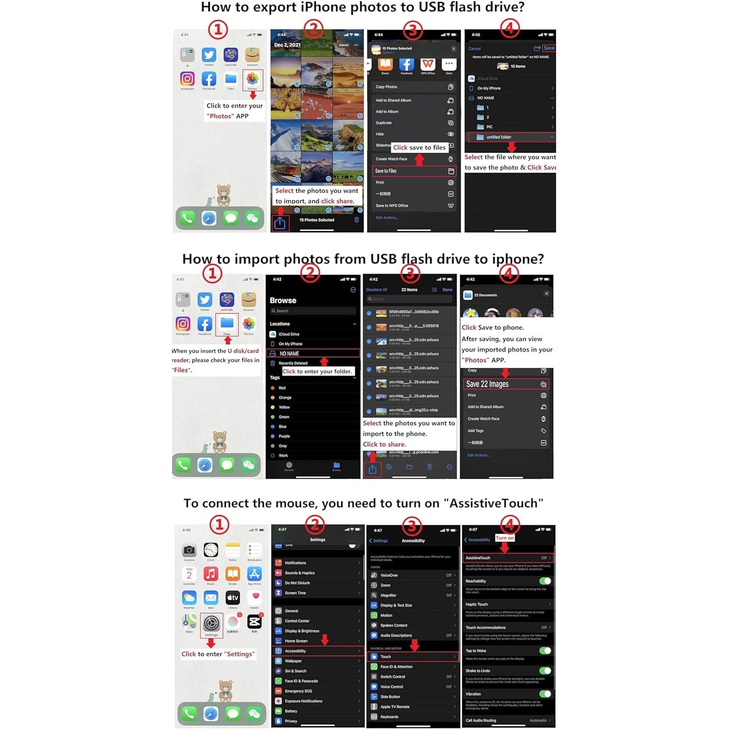 - 【Strong Compatibility:】USB to iPad adapter is compatible with iPhone, compatible with iPad Pro/iPad Air/iPad mini, iPhone 14/13/12/11 series, 8/7 series, X series/SE series. Support photo format JPG/RAW, video format H.264 and MPEG-4. USB flash drive must be FAT32 or exFAT. NTFS is not supported, this product cannot power the device.