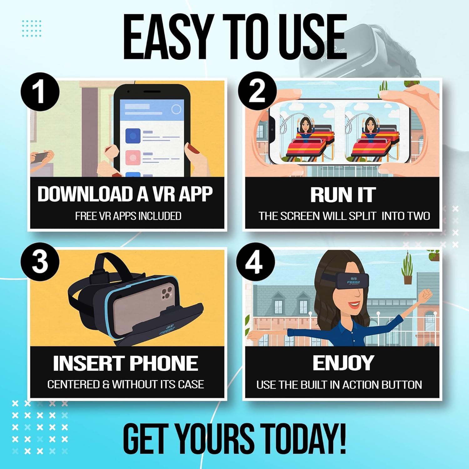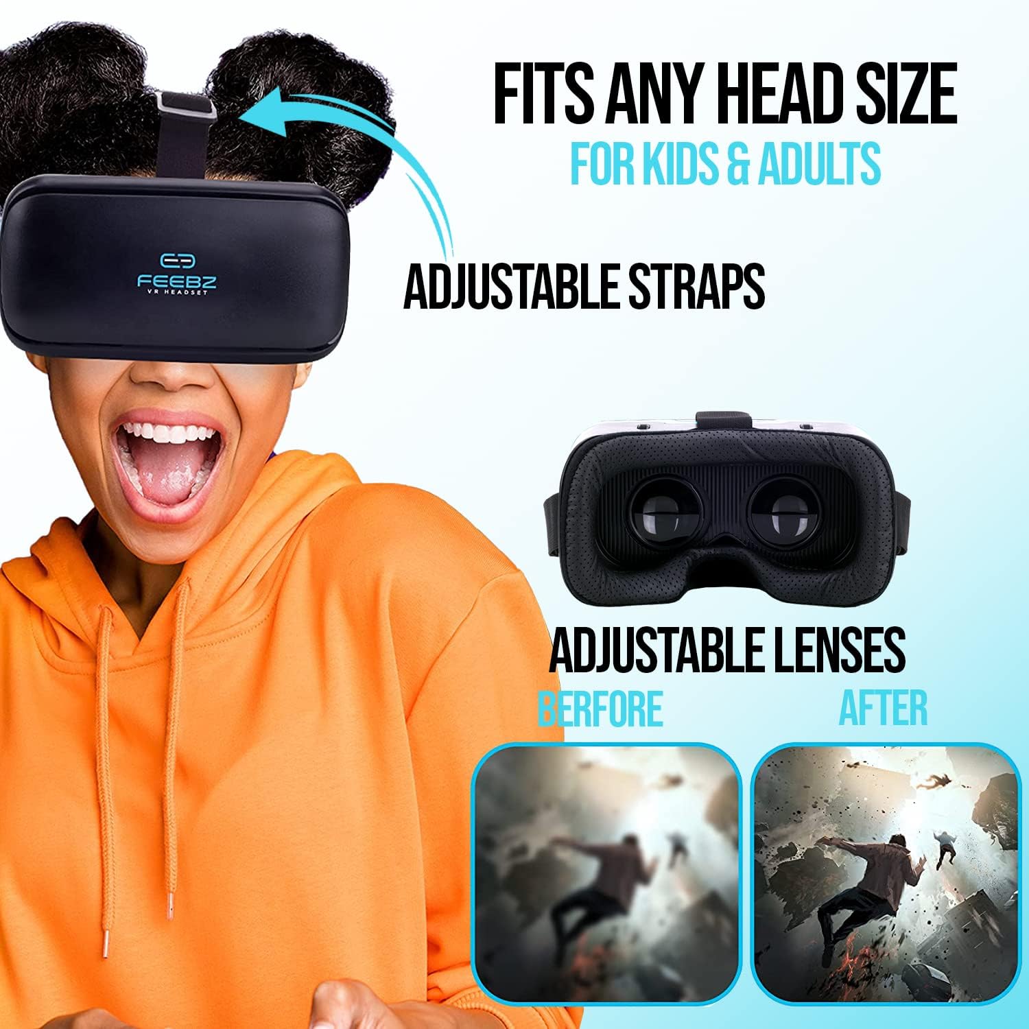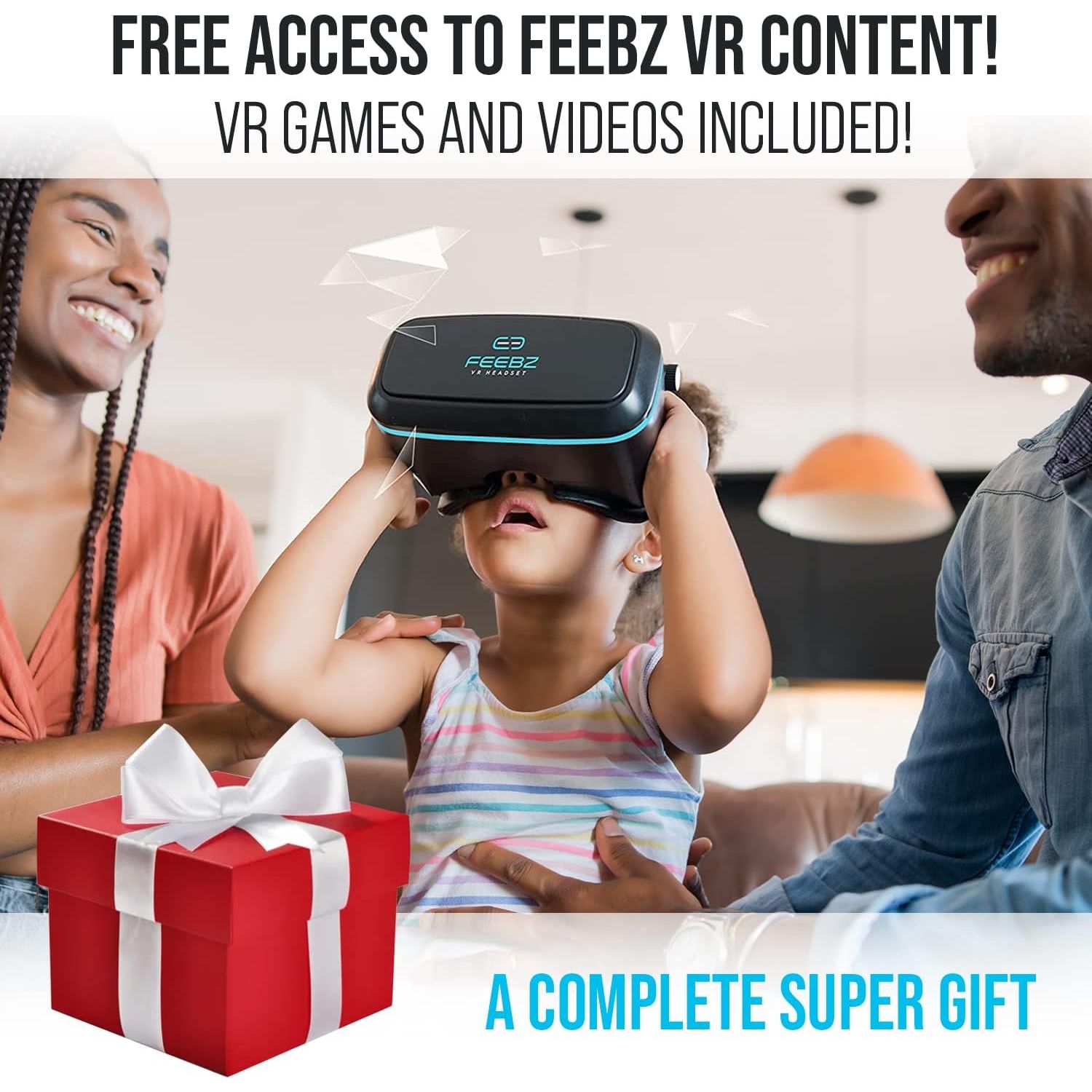 Feebz VR headsets come with free apps, games, videos, and tutorial for easy use, and are designed for comfort and gaming with adjustable fit and action button.