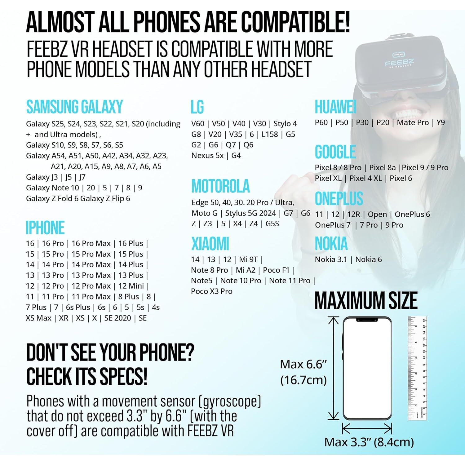 - Compatibility - Feebz VR headset for iPhone & Android model 1.0 fits a wide range of phone models.