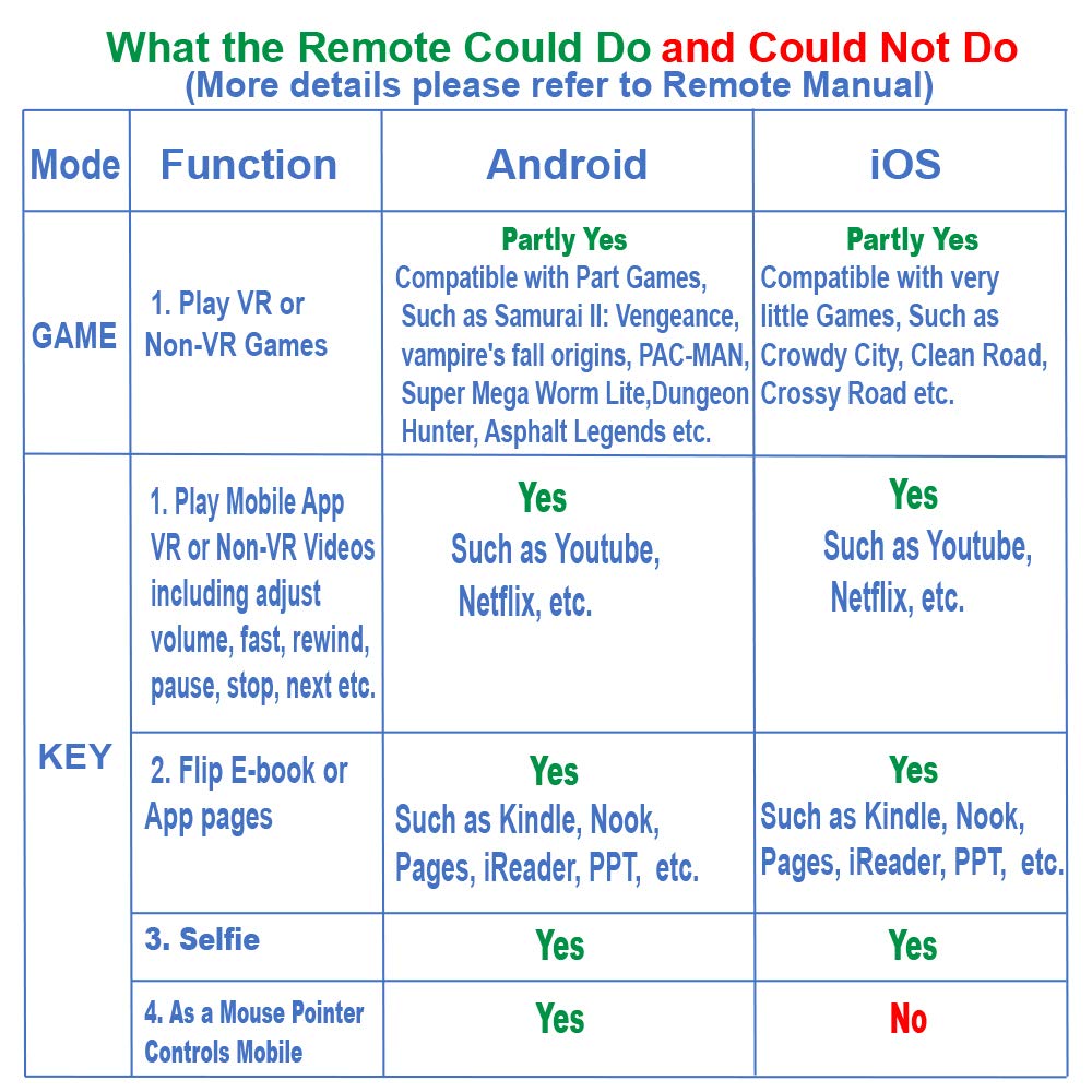 - ✅3. For Android system Phones, this controller could do below remote controlling: 1). Adjusting and muting volume; 2). Playing video or music; 3). As a shutter for selfie or taking photo; 4). E-book flip in iReader such as kindle, nook, ppt; 5). Mouse operation; 6). Fully remote control functions will be available in VR games.