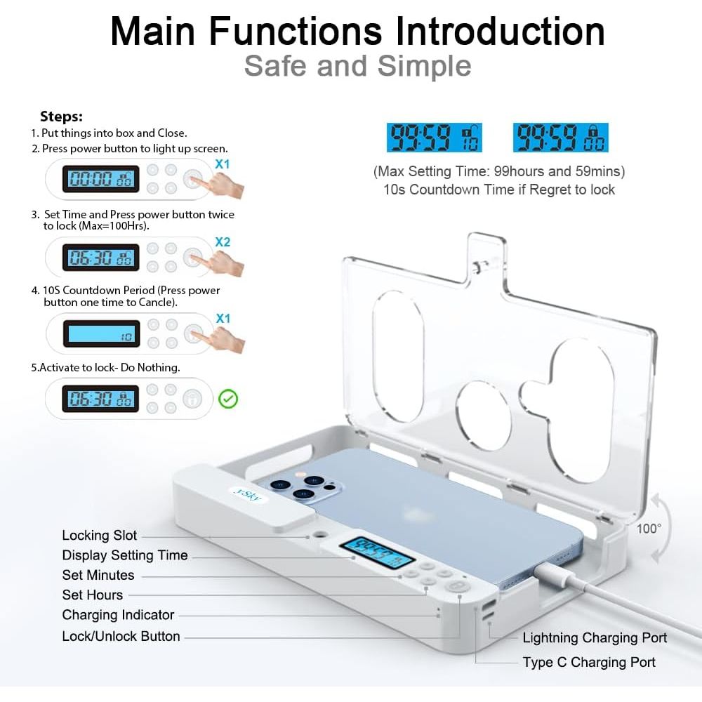 - 【30 days long working Time with Auto-Timer】: Max working Time Reach Up 30Days Once Full Charge. Max setting Time is 99hrs and 59mins ,Super standby time over 90 days.Phone jail box with timer can make you reduce screen time, focus on work, study and life, effectively multiply your time.