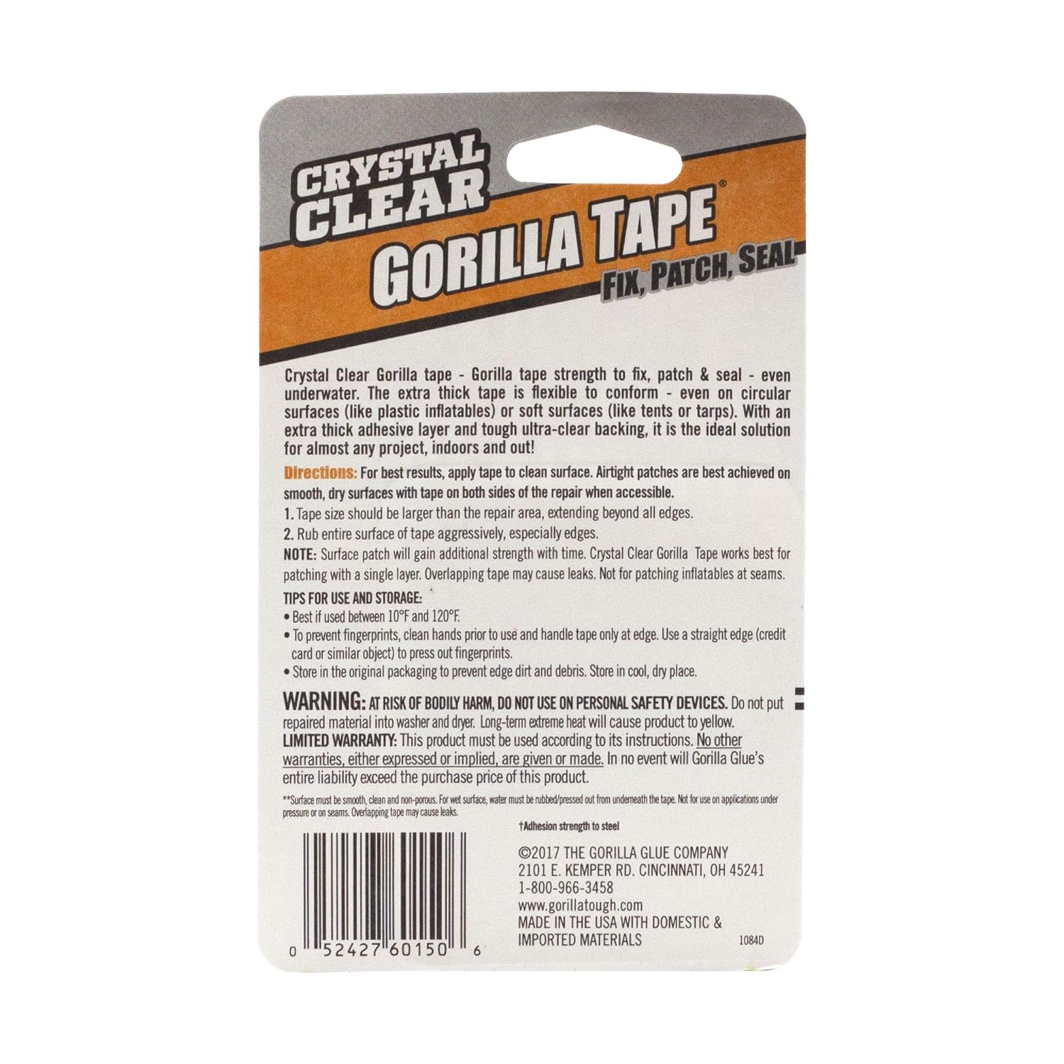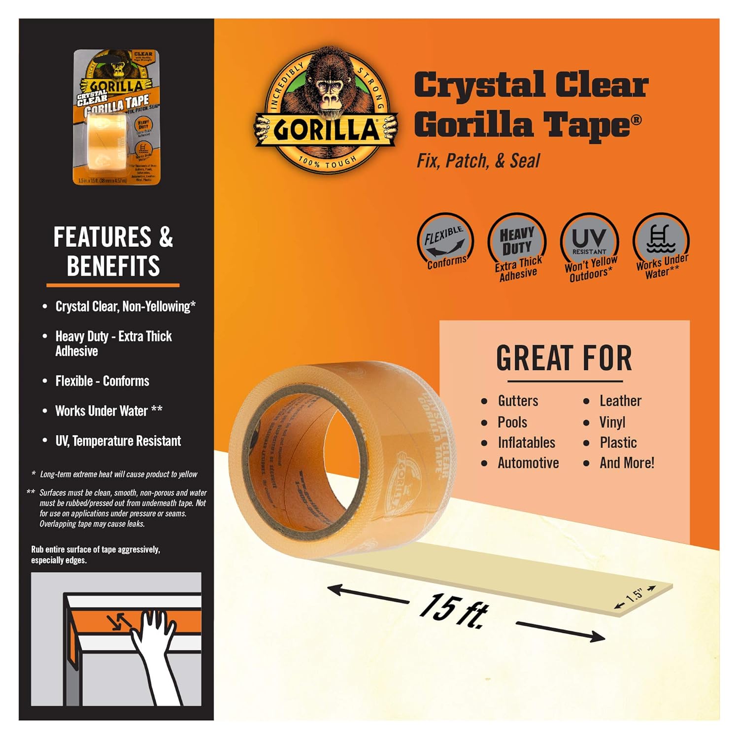 - Gorilla Crystal Clear Repair Duct Tape, 1.88” x 5 yd, Clear, (Pack of 1)