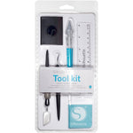 All the tools you need for your Silhouette machine (sold separately). This 5.5x4.25x.75 inch package contains one hook, one scraper, one spatula, one pick-me- up, one ruler, and one microfiber cloth. Imported.
