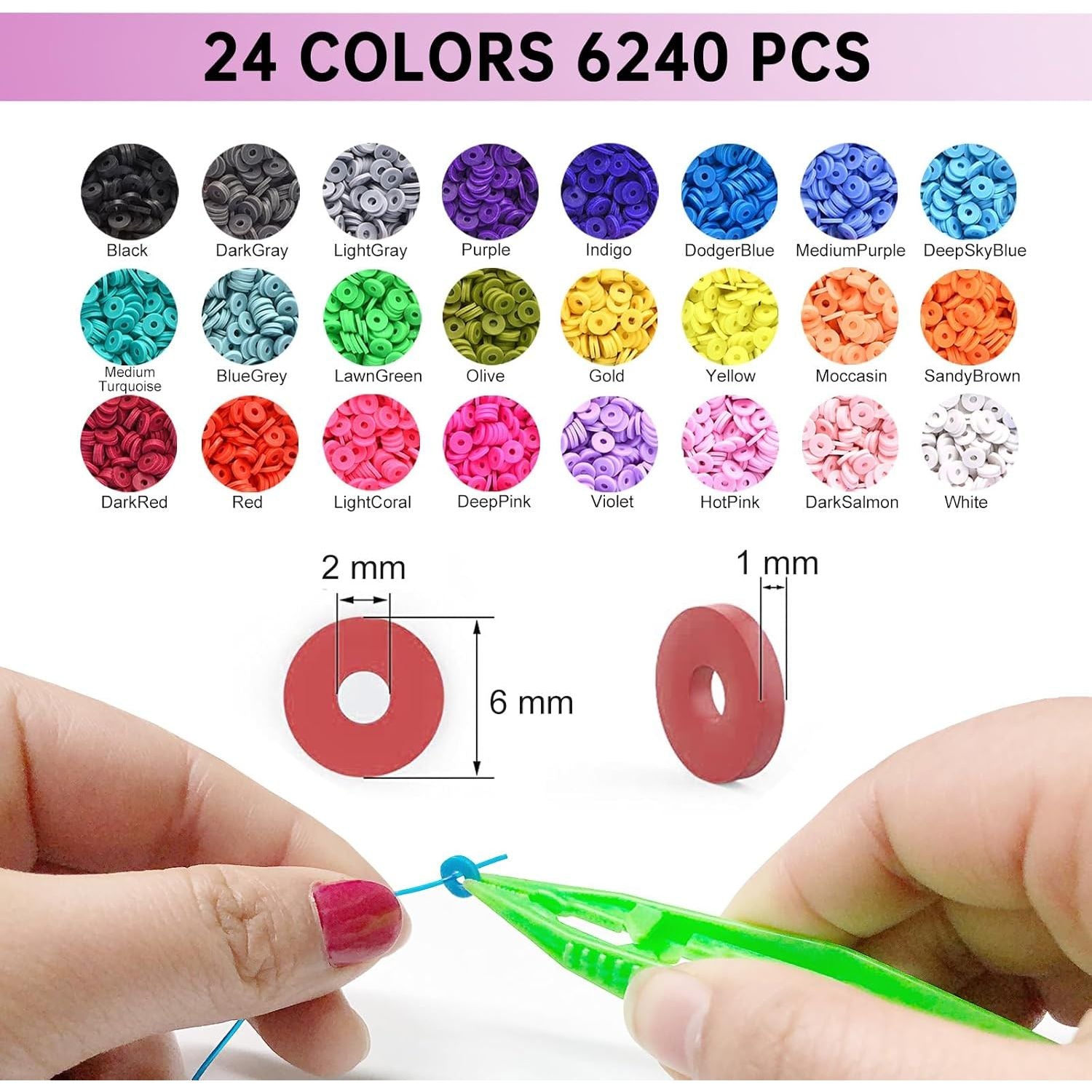 - ALL YOU NEED INCLUDED - The colors are bright and beautiful. This bead bracelet set contains 6240 6mm clay beads in 24 colors, 750 letter beads and some other beads including heart beads, star beads, pearls and flower beads, also a pair of plastic tweezers, a pair of scissors, and four rolls of elastic bracelet string cord