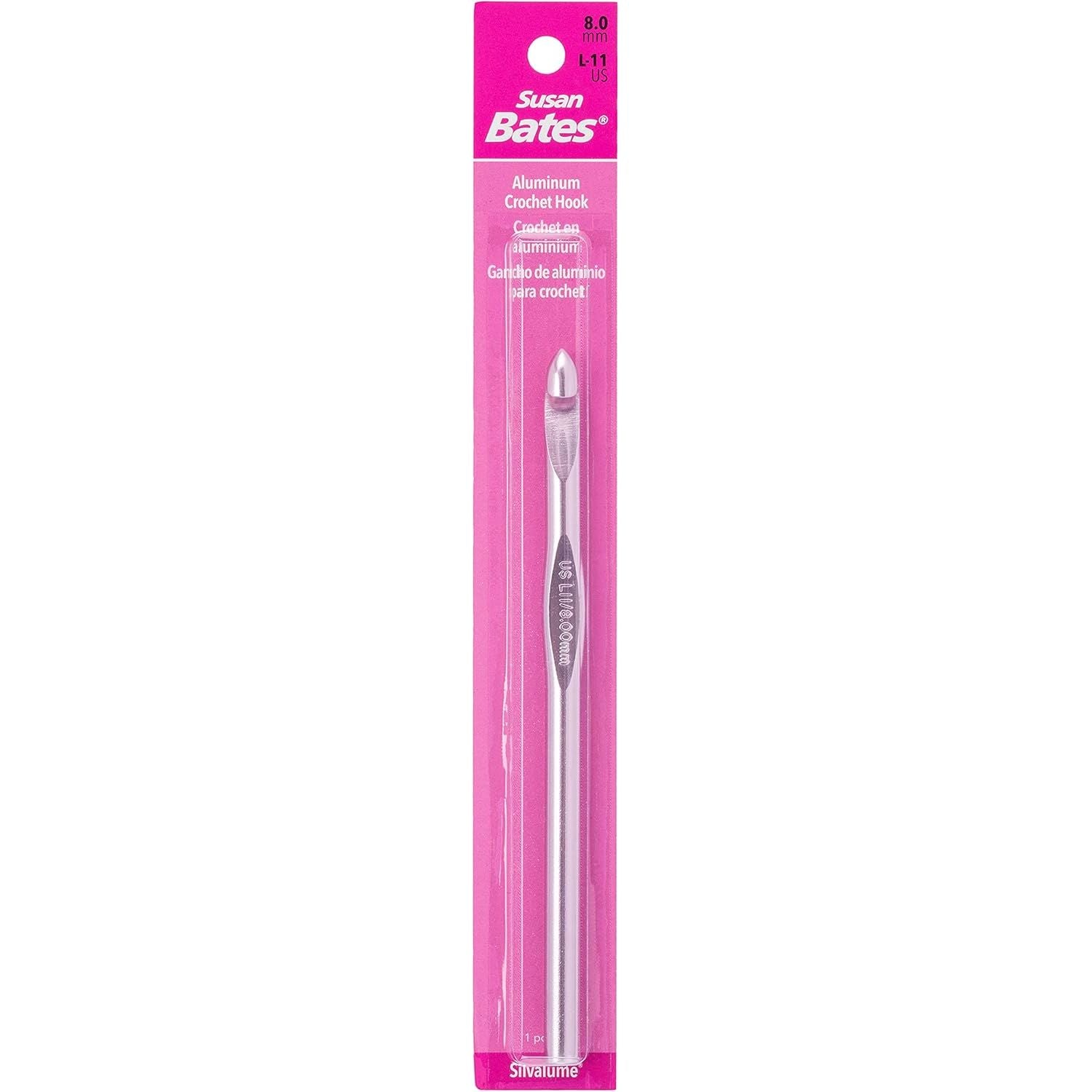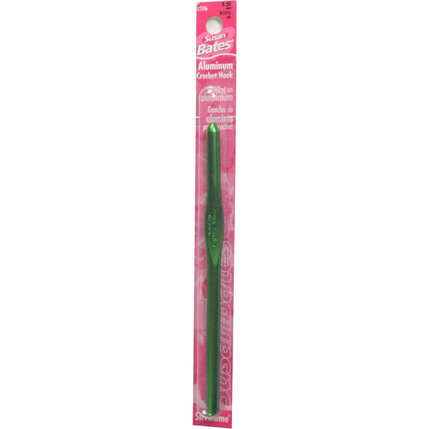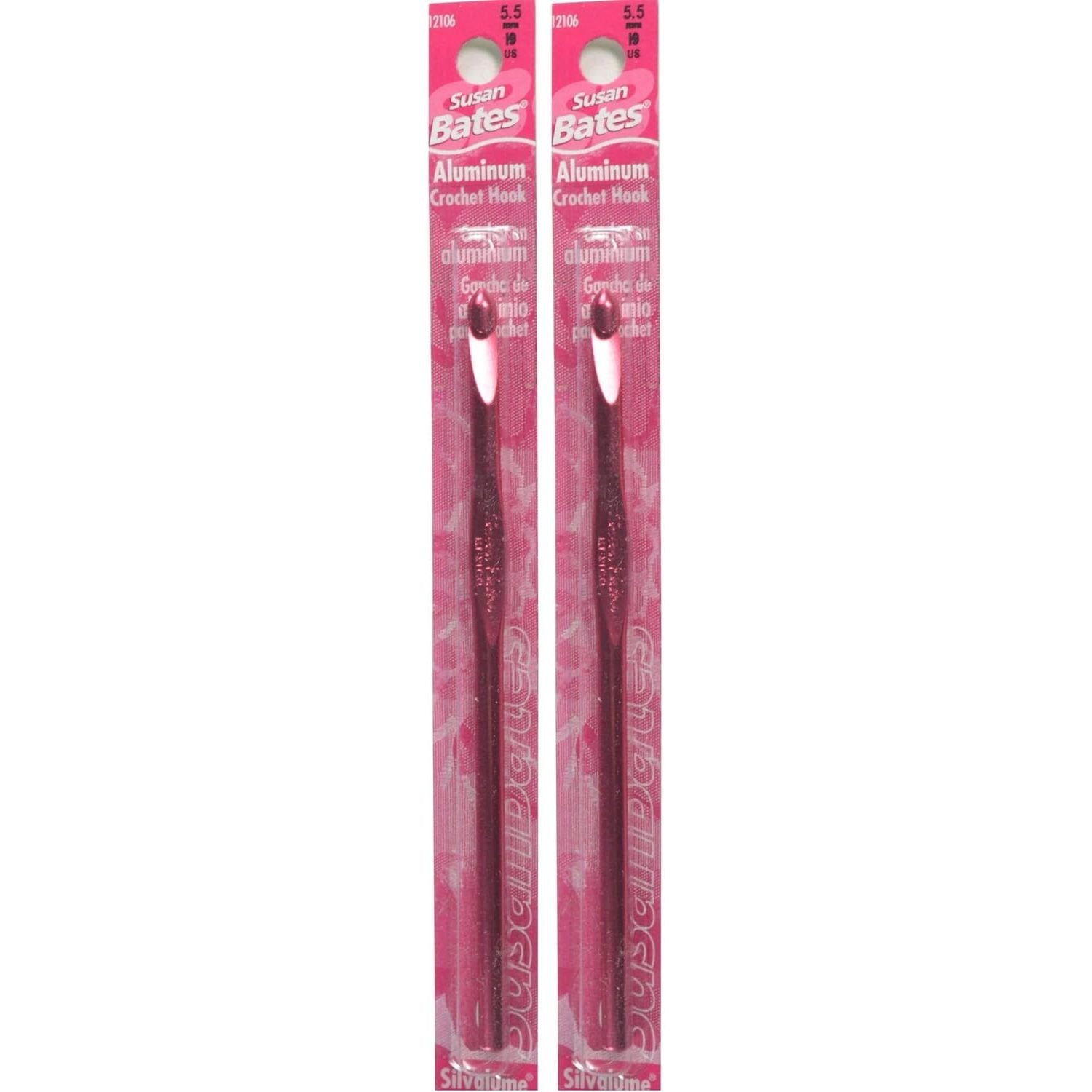 These hooks have the biggest size range in the Susan Bates label. Made of lightweight aluminum, each Silvalume hook undergoes a special anodizing process that etches away all surface impurities. In addition, each hook is heat treated for strength and durability and polished for a velvety smooth finish. The famous in-line head helps reduce wrist motion for fatigue-free crocheting and helps maintain a more consistent gauge. This package contains a 5.5 inch aluminum crochet hook. Size: I9/5.5mm. Imported.