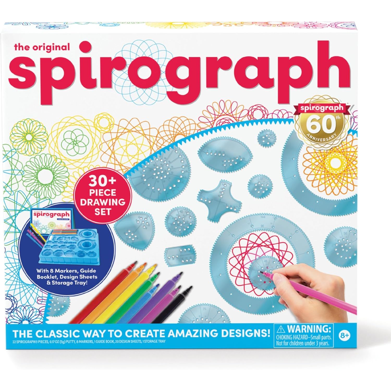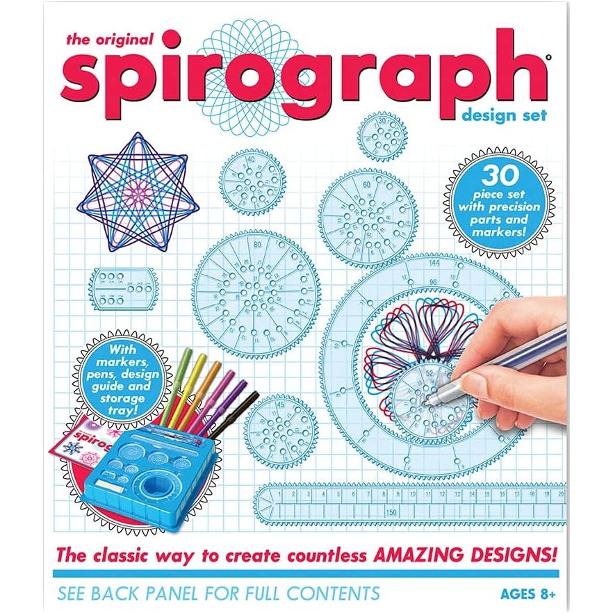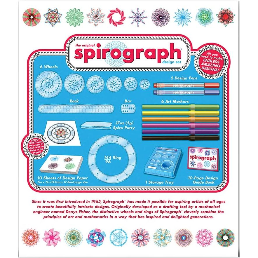 Product Description The classic way for aspiring artists to create millions of amazing designs is back and better than ever! The Original Spirograph Design Set features the iconic wheels and rings of the original, re-engineered and updated for today. The kit features a travel-friendly, collectors tin with snap-in storage tray. The precision-engineered Spirograph gears work with the two design pens included in the set, as well as with most standard pens, markers and pencils. The new Spirograph putty holds the Spirograph pieces securely on the paper so that you can create intricately beautiful designs with no holes in the paper! The set also comes with a 24-page design pad and a full-color design guide, which explains the fundamentals of drawing with Spirograph, as well as step-by-step instructions for creating your own designs! From the Manufacturer Introduce your children to the fascinating Spirograph. Spirograph interlocking gears help you create countless one-of-a-kind designs. Select one of the Spirograph wheels, place it inside the Spirograph ring and use the included pen to make whirling, swirling designs. Children will be enchanted by the complex designs they can make with these few simple tools. Makes a great gift. This boxed set includes 7 Spirograph wheels, 1 Spirograph ring, 1 Spirograph rack, 6 oz. of reusable Spiro-putty, 2 retractable multi-color pens, 10 sheets of design paper, a 10-page guidebook and a snap-in storage tray to keep your Spirograph set all in one place. Generations of children have drawn twisting, turning spiral shapes, using the Spirograph's interlocking gears and special pens. Now a new generation of kids will fall in love with Spirograph. Suitable for ages 8 and up.