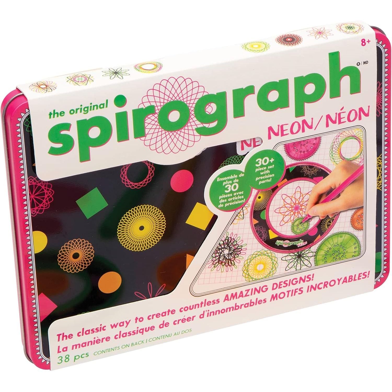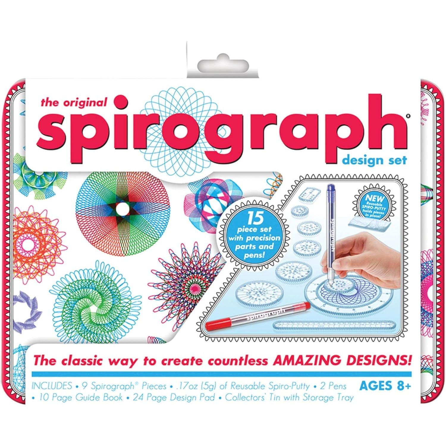 Product Description The classic way for aspiring artists to create millions of amazing designs is back and better than ever! The Original Spirograph Design Set features the iconic wheels and rings of the original, re-engineered and updated for today. The kit features a travel-friendly, collectors tin with snap-in storage tray. The precision-engineered Spirograph gears work with the two design pens included in the set, as well as with most standard pens, markers and pencils. The new Spirograph putty holds the Spirograph pieces securely on the paper so that you can create intricately beautiful designs with no holes in the paper! The set also comes with a 24-page design pad and a full-color design guide, which explains the fundamentals of drawing with Spirograph, as well as step-by-step instructions for creating your own designs! From the Manufacturer Since it was first introduced in 1965, Spirograph has made it possible for aspiring artists of all ages to create beautifully intricate designs, originally developed as a drafting tool, by a mechanical engineer named Denys Fisher, the distinctive wheels and rings of the Spirograph cleverly combine, the principles of art and mathematics in a way that has inspired and delighted generations. Now you too can create your own cool designs and awesome pictures with the help of this fun and classic Spirograph drawing accessory. Put your paper in place and then choose again and again from 19 different gears to mix and match patterns and create a totally awesome image. Use the design guide to try out tried and true designs or get creative and create cool and colorful graphics of your own. Drawing accessory includes tray with built-in storage and includes 7 wheels, 1 gear ring, 1 gear rack, 2 ball point retractable pens, Spiro-Putty, a 12 page design guide and a 24 page, 5"x7" design pad.