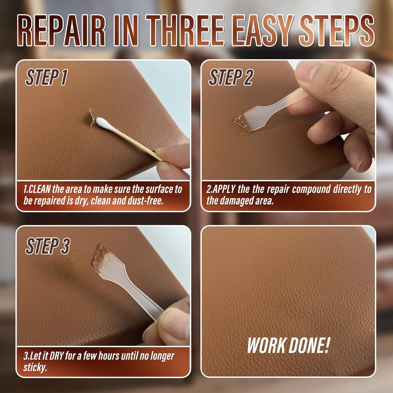 - PROFESSIONAL RESULTS : This repair kit comes with detailed step-by-step directions and made of high quality, super-fast drying liquid repair adhesive compound that will help repair scratch, cut, hole, tear, rip, crack, mark, pet cat or dog damage on your damaged, cracked, scratched, peeling leather. To make your new or old genuine leather, faux, imitation or premium upholstery as good as new