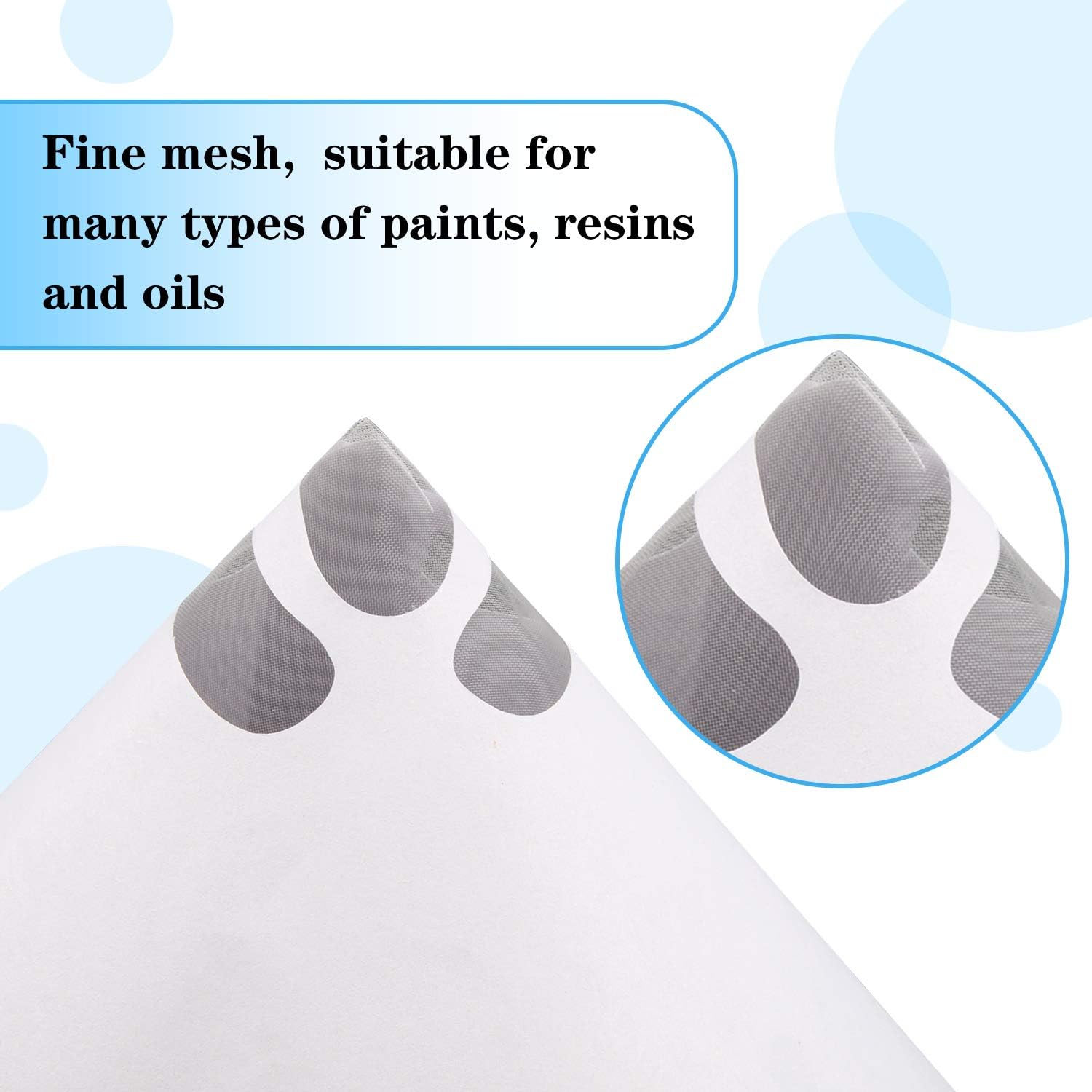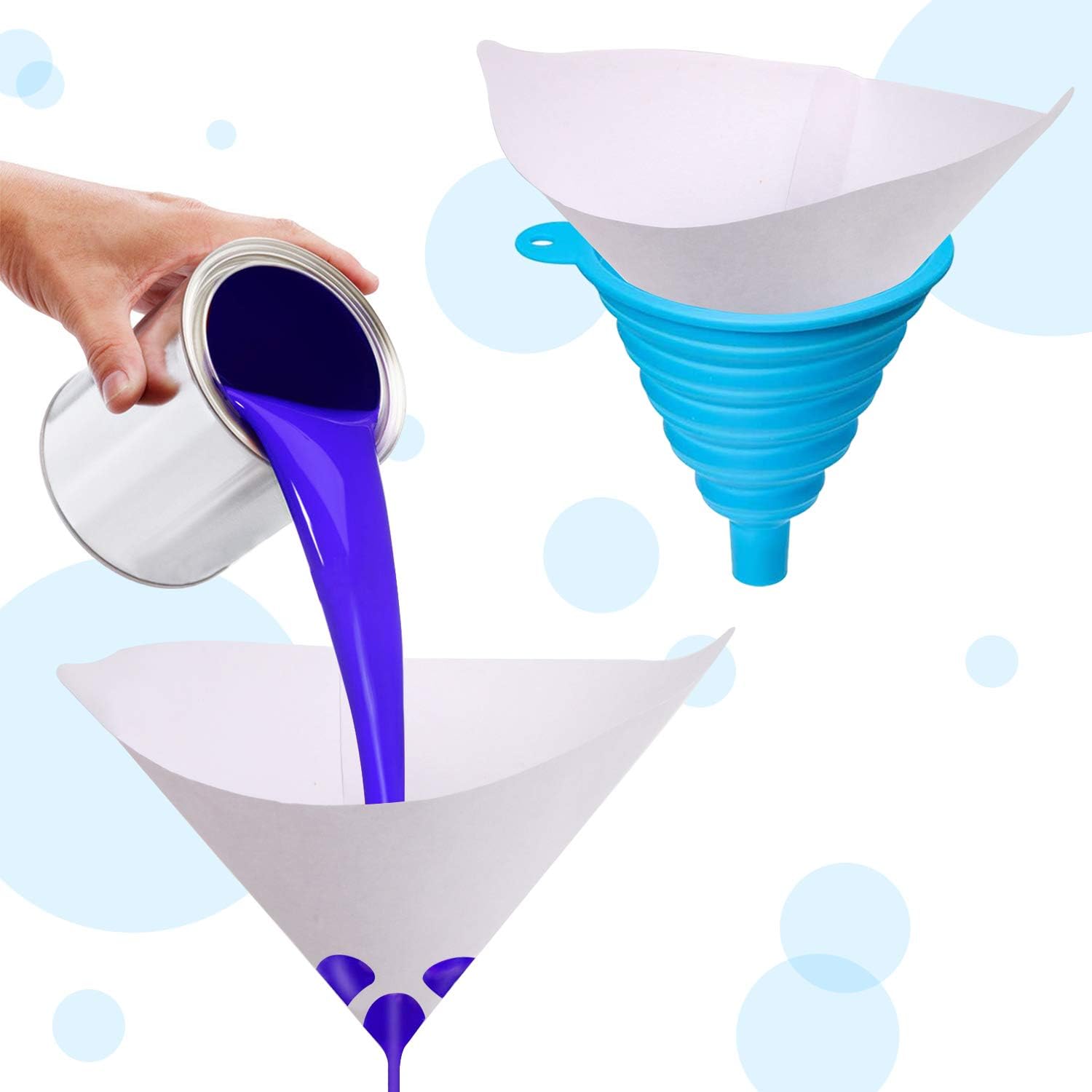 - PACKAGE INCLUDES : 300 pcs paint filter strainer, 3 pcs foldable cone silicone funnel filter, which meet many times of automobile painting work.