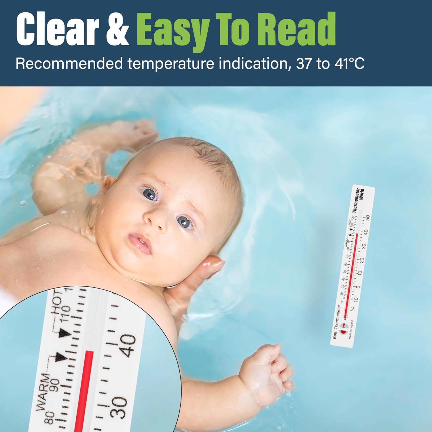 - CLEAR DESIGN - This bath thermometer has a white case and black temperature scale making it very clear to read.