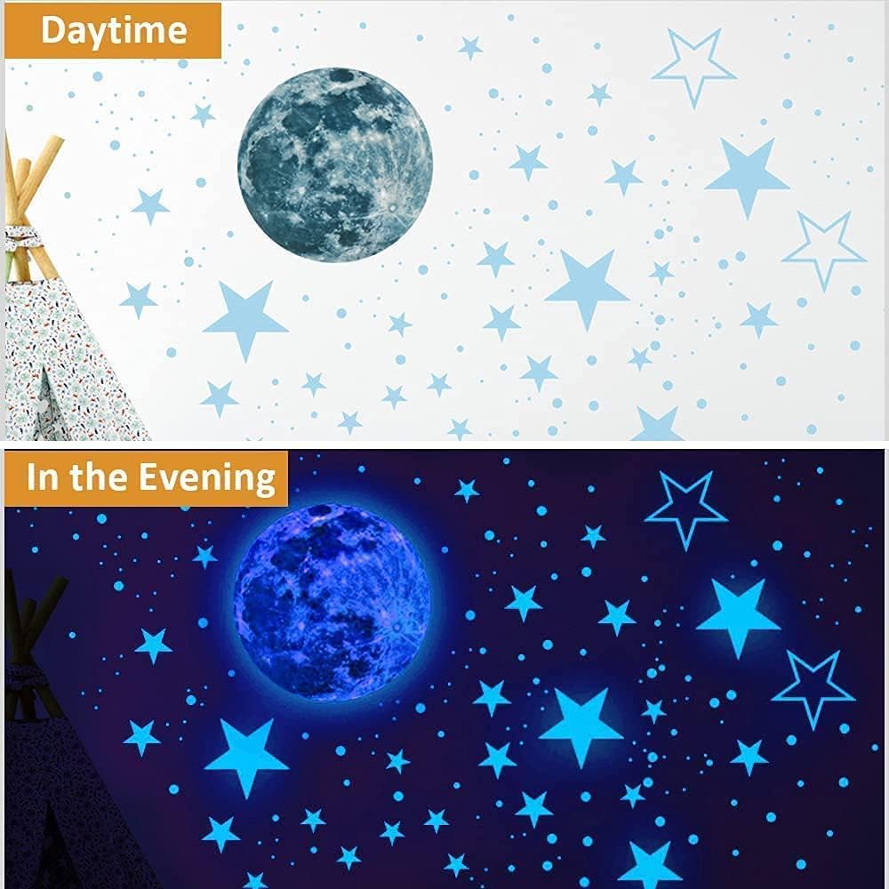 - Super Bright and Lasting Glowing: You just need to put it under lamplight flashlight or sunshine for 20minutes, the moon and star wall stickers will keep glowing for 8-15 hours because the stickers need to absorb light before glowing. The longer it takes to absorb light, the to light up for up to longer