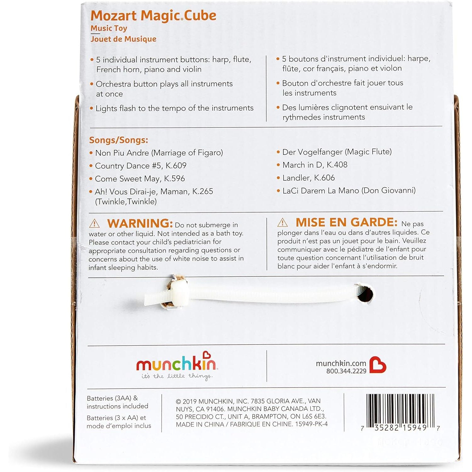 At one point or another, every parent has experienced a particularly loud and headache-inducing toddler toy. But believe it or not, there are toys that make beautiful music too. Perfect for all ages, Munchkin's Mozart Magic Cube inspires creativity and interactive play while teaching how sounds combine to create eight classical music masterpieces by the master composer. With a touch of a button, this interactive cube lets your child add or subtract from any combination of five different instruments, including harp, French horn, piano, flute and violin. Each selected instrument button flashes to the tempo of the music. An orchestra button even plays all the instruments at once. Two volume levels let you choose the right level of sound. The Magic Mozart Cube provides a fun musical foundation for your little one. And that's music to your ears - in more ways than one. Requires three AA batteries (included).