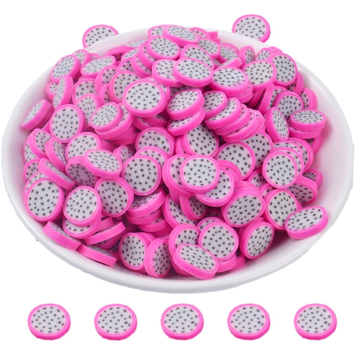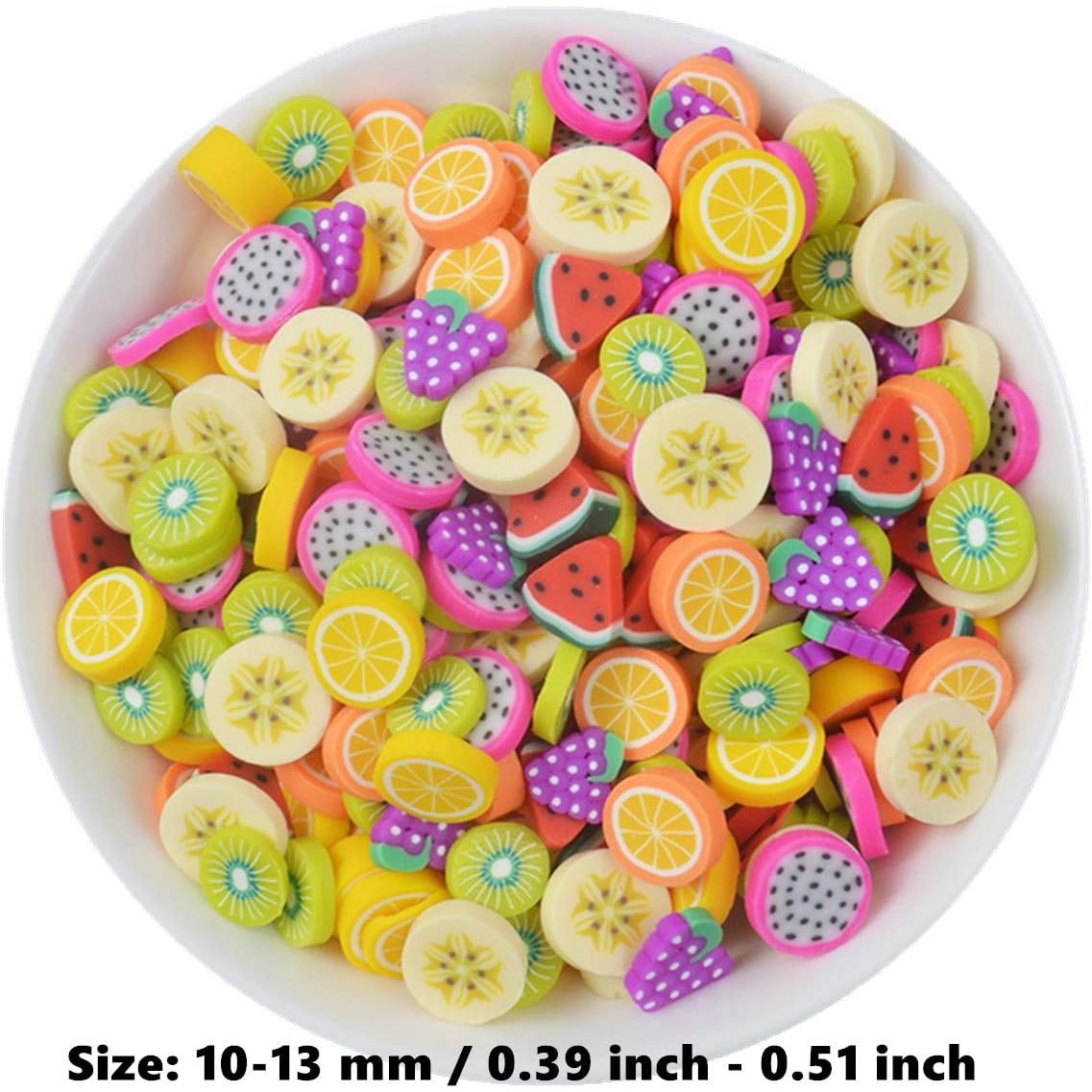 • FRUITS CHARMS FOR SLIME:Assorted 100pcs Dragon fruit Kiwi banana grape watermelon orange lemon slime cabochon,size is about 10-13mm/0.39-0.59inch.Mini resin assortments are suitable for hair accessories,jewelry making accessories,home garden miniature.