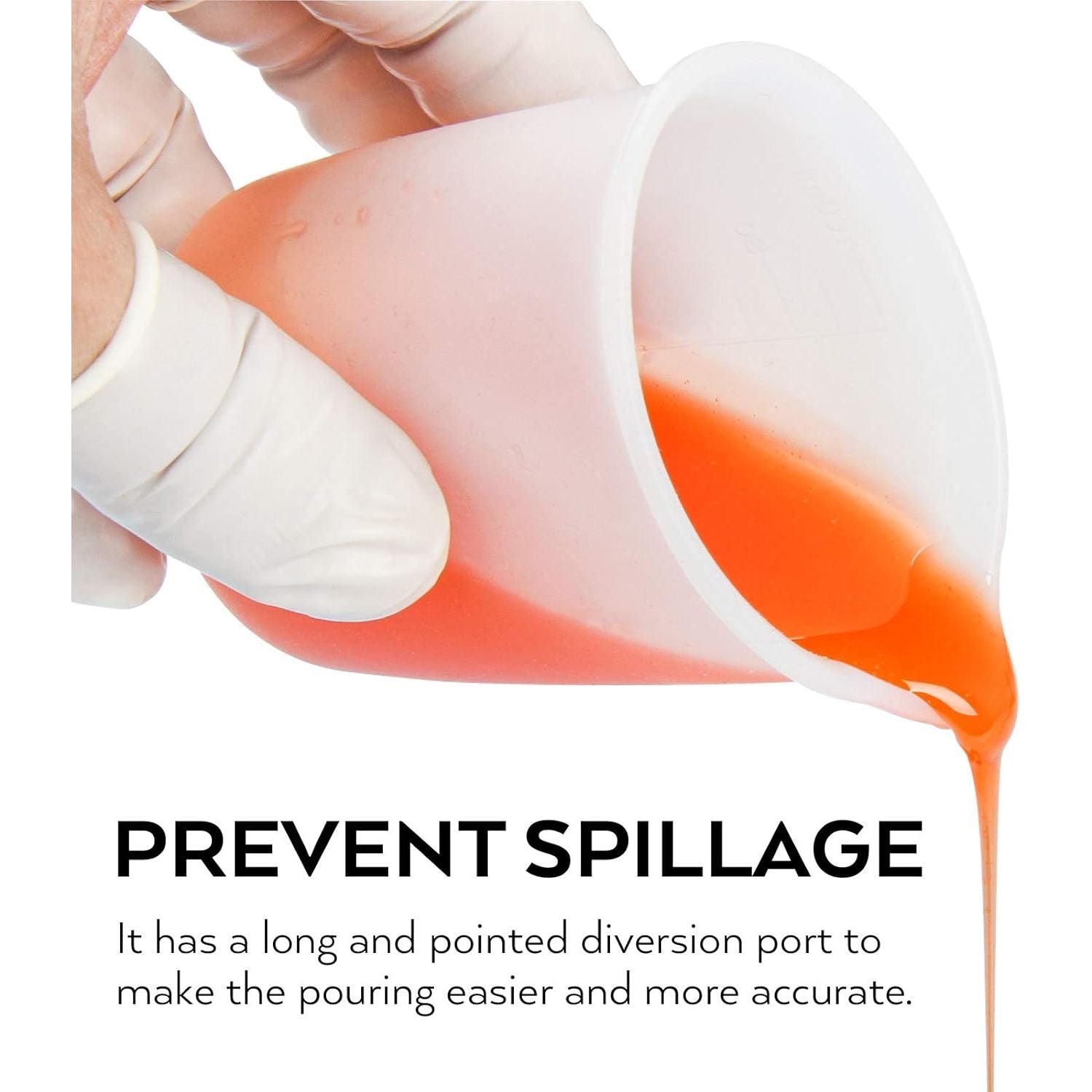- 250 ml & 100ml Measure Cups: Made of silicone,flexible and durable,non toxic, smooth and non-stick, with angled diversion port design, make the pouring easier,more accurate and prevent the liquid from remaining on the outer wall of the cup and keep it clean
