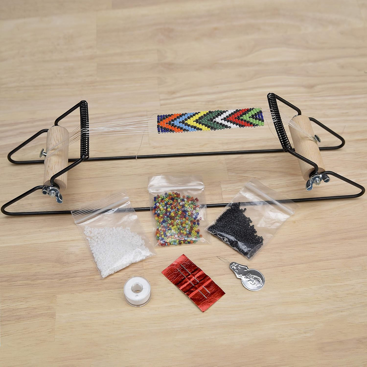 - Complete kit includes metal bead loom, 1,000 multi-color glass beads, threads, needles, and illustrated instructions with patterns