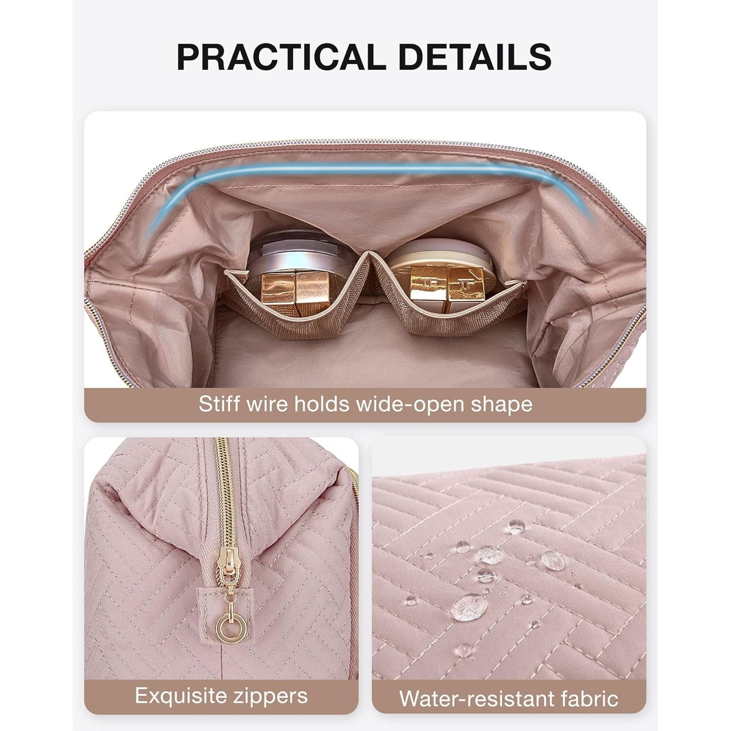 - 【CONVENIENT DESIGN】- Wide-open design makeup bag brings a easier way for you to take your cosmetics. 2 mesh pockets in the main compartment can store small items.