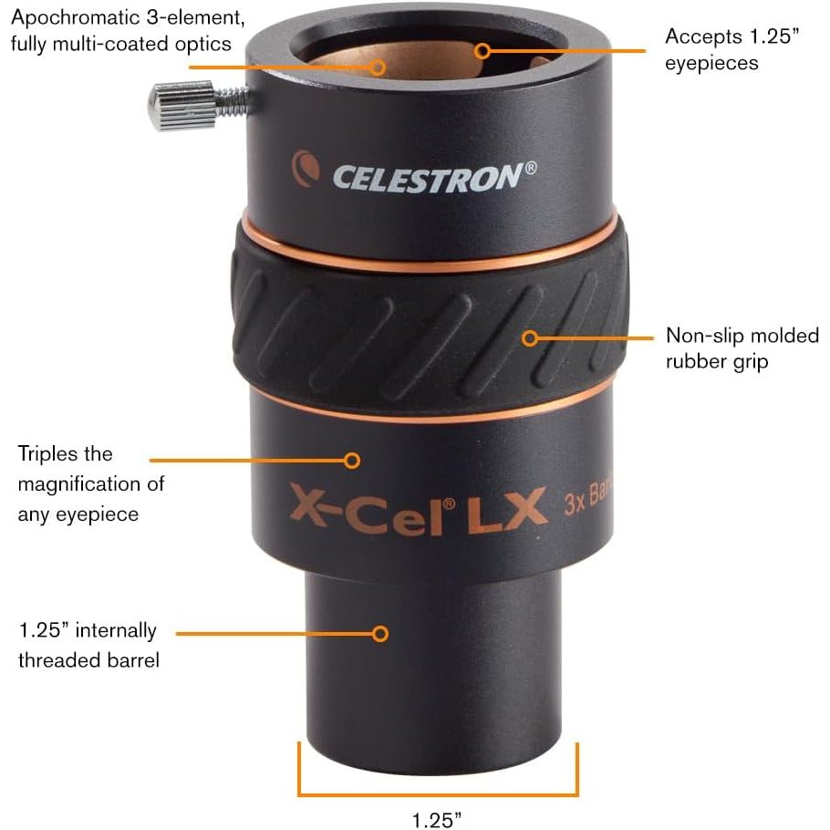Product Description When inserted between the eyepiece and telescope, this premium 3x Barlow lens triples the magnification of all your 1. 25" eyepieces. This is a perfect accessory for owners of short, fast telescopes, and is especially helpful for boosting the magnification during lunar or planetary observations under good seeing conditions. The apochromatic, fully multi-coated optics offer great color correction and contrast. The black anodized housing with orange highlights matches the eyepieces in the Celestron X-Cel LX line. A centralized rubber grip helps to keep your hands securely on the barrel, even when your fingers are cold or you are wearing gloves. A brass compression ring just inside the top of the X-Cel Barlow grabs your eyepiece gently but firmly when you turn the thumbscrew. Once the thumbscrew has been secured in place, the brass ring keeps your eyepiece in the Barlow instead of relying on the tip of the thumbscrew itself, offering a better and protecting the barrel from scratches. The barrel of the Celestron X-Cel LX 3X Barlow is threaded to accept 1. 25" filters, allowing you to change eyepieces without requiring you to remove and re-attach the filter from each eyepiece barrel. Set Contains: 1 x X-Cel LX 3x Barlow Lens 1.25 inches
