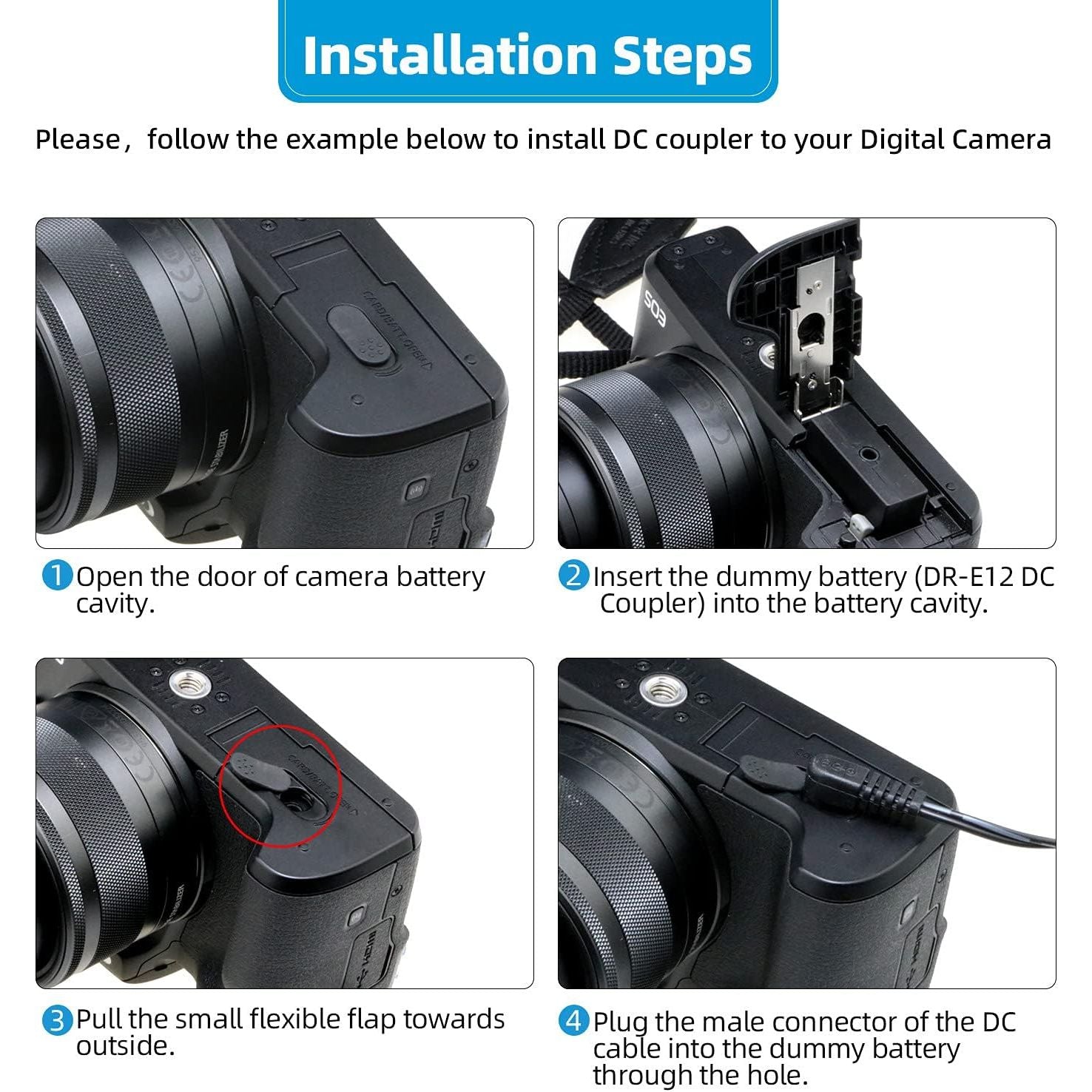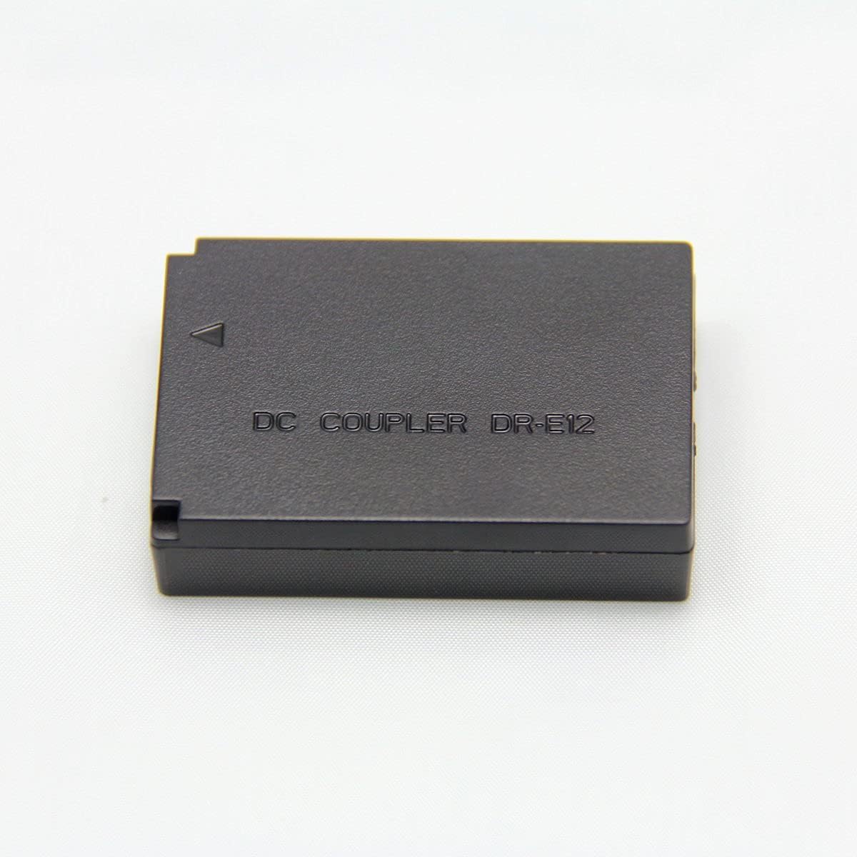 - 【Function】DR-E12 DC Coupler kit replaces the LP-E12 camera battery and connects to an ac adaptor to power your camera from an AC outlet. Useful for lengthy studio shoots with no need to continuously replace and recharge multiple batteries.