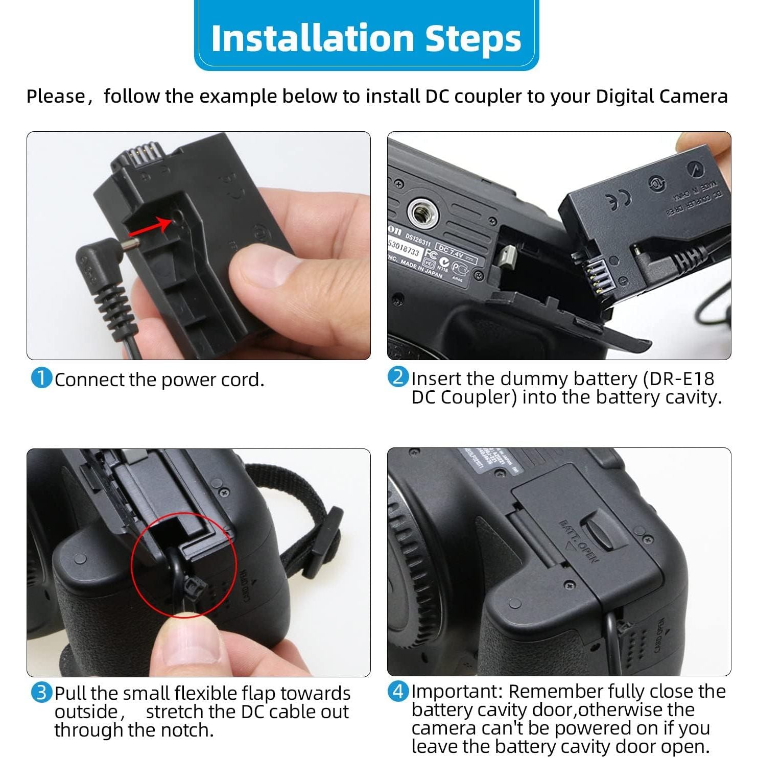 - 【Function】DR-E8 DC Coupler kit replaces the LP-E8 camera battery and connects to an ac adaptor to power your camera from an AC outlet. Useful for lengthy studio shoots with no need to continuously replace and recharge multiple batteries.