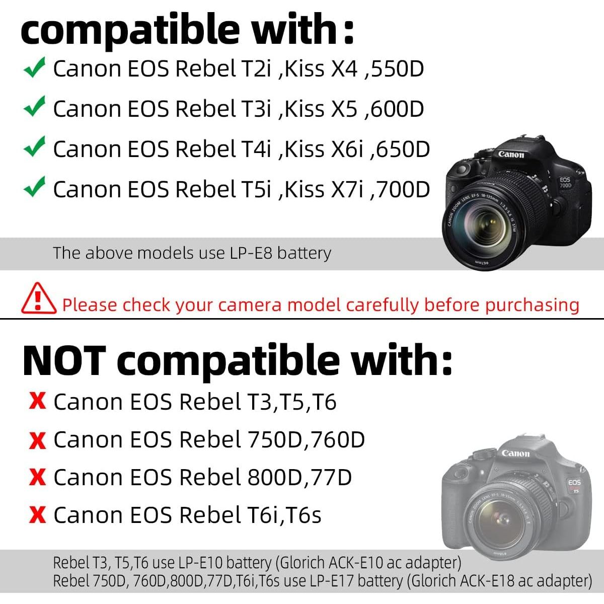 - 【Compatible Models】GLORICH ACK-E8 AC Power Adapter DR-E8 DC Coupler LP-E8 Dummy Battery Power Supply Kit Compatible with Cameras Canon EOS Rebel T5i T4i T3i T2i 700D 650D 600D 550D Kiss X7i X6i X5 X4. DISCLAIMER: This product is NOT compatible with Canon T3 or T5, which is entirely different with T3i or T5i camera.