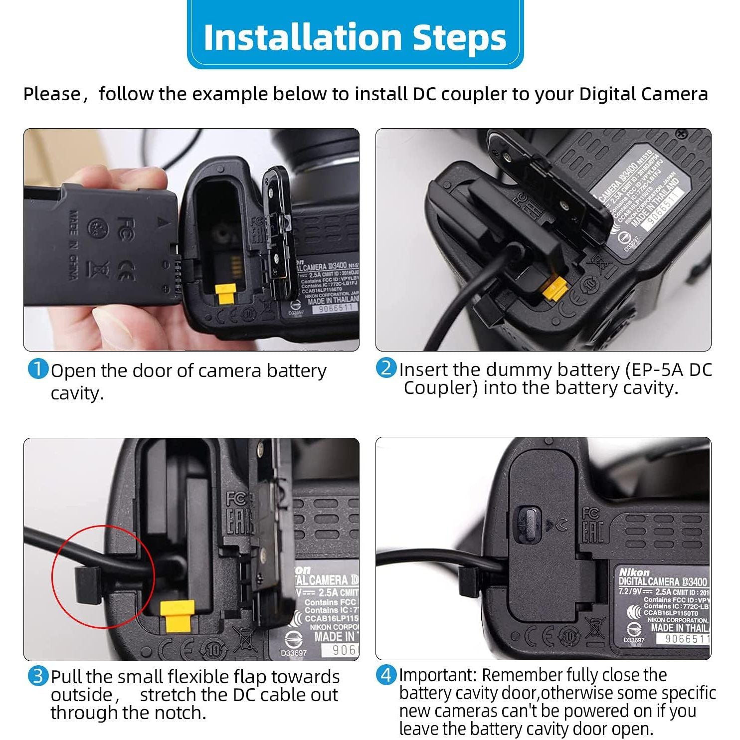 - 【Function】EP-5A DC coupler power connector kit replaces the EN-EL14 ENEL14 / EN-EL14a ENEL14a camera battery and connects to an AC adaptor EH-5 / EH-5a / EH-5b to power your camera from an AC outlet. Useful for lengthy studio shoots with no need to continuously replace and recharge multiple batteries.