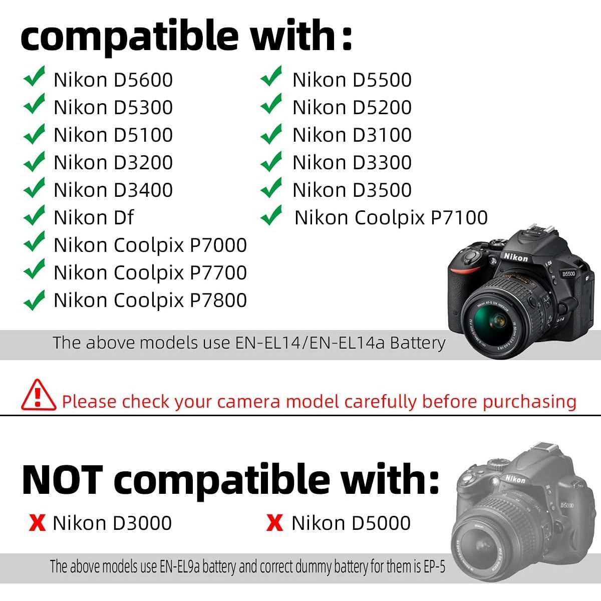 - Glorich EP-5A DC Coupler EN-EL14 EN-EL14a Dummy Battery EH-5 AC Power Supply Adapter Power Connector for Nikon Coolpix P7000 P7100 P7700 P7800 Df D3100 D3300 D3400 D3500 D5100 D5200 D5300 D5500 D5600