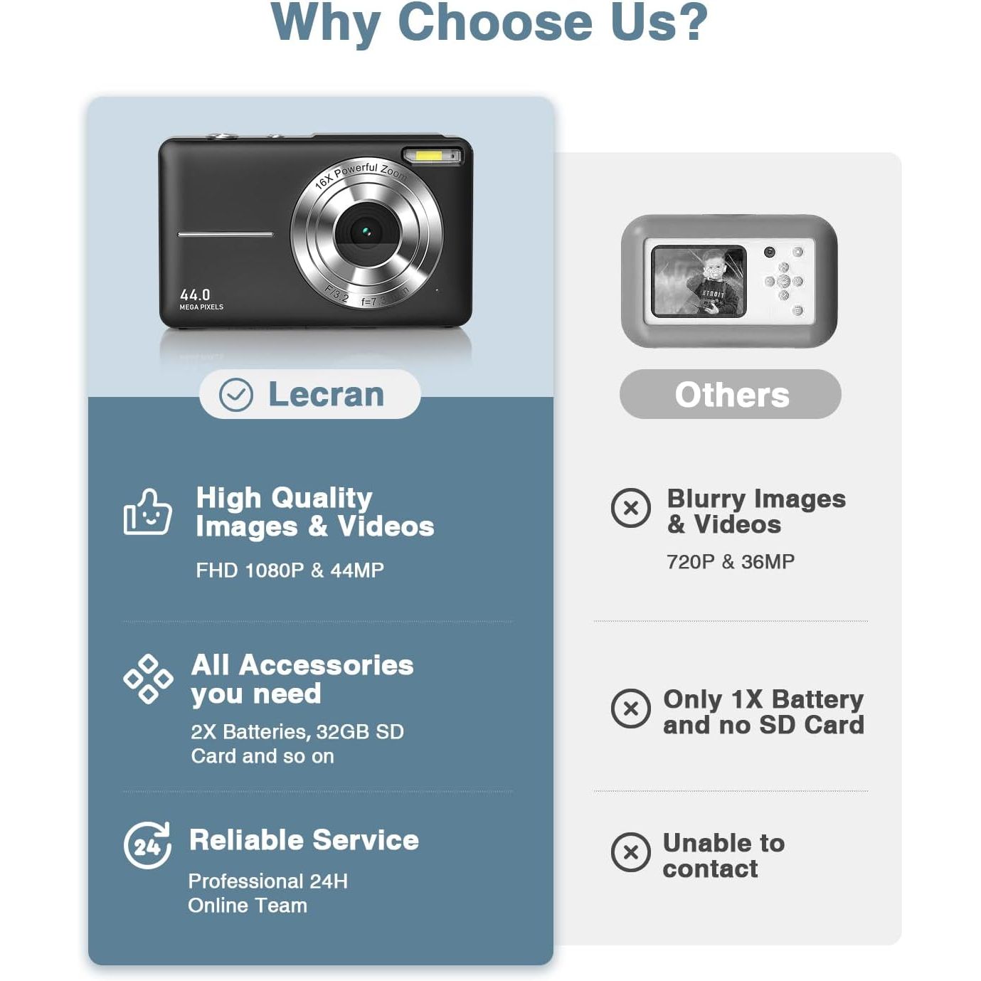 - Lecran Digital Camera, FHD 1080P Kids Camera with 32GB Card, 2 Batteries, Lanyard, 16X Zoom Anti Shake, 44MP Compact Portable Small Point Shoot Camera for Kids Children Teens Girl Boy(Charcoal)