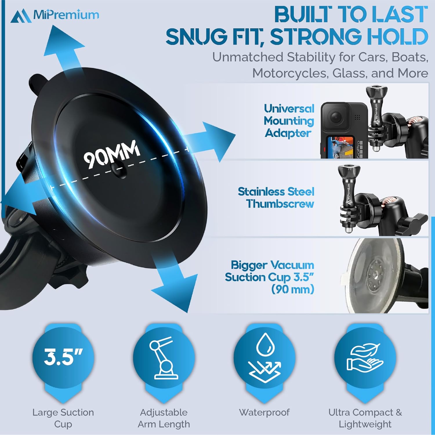 MiPremium Car Suction Cup Mount for GoPro Hero 13 12 11 10 9 8 7 6 5 4 3 3+ 2 Session Black Silver XIAOYI 4K SJCAM Yi Sports Action Camera Dash Cam holder perfect for Boats Vehicle Windshield & Window