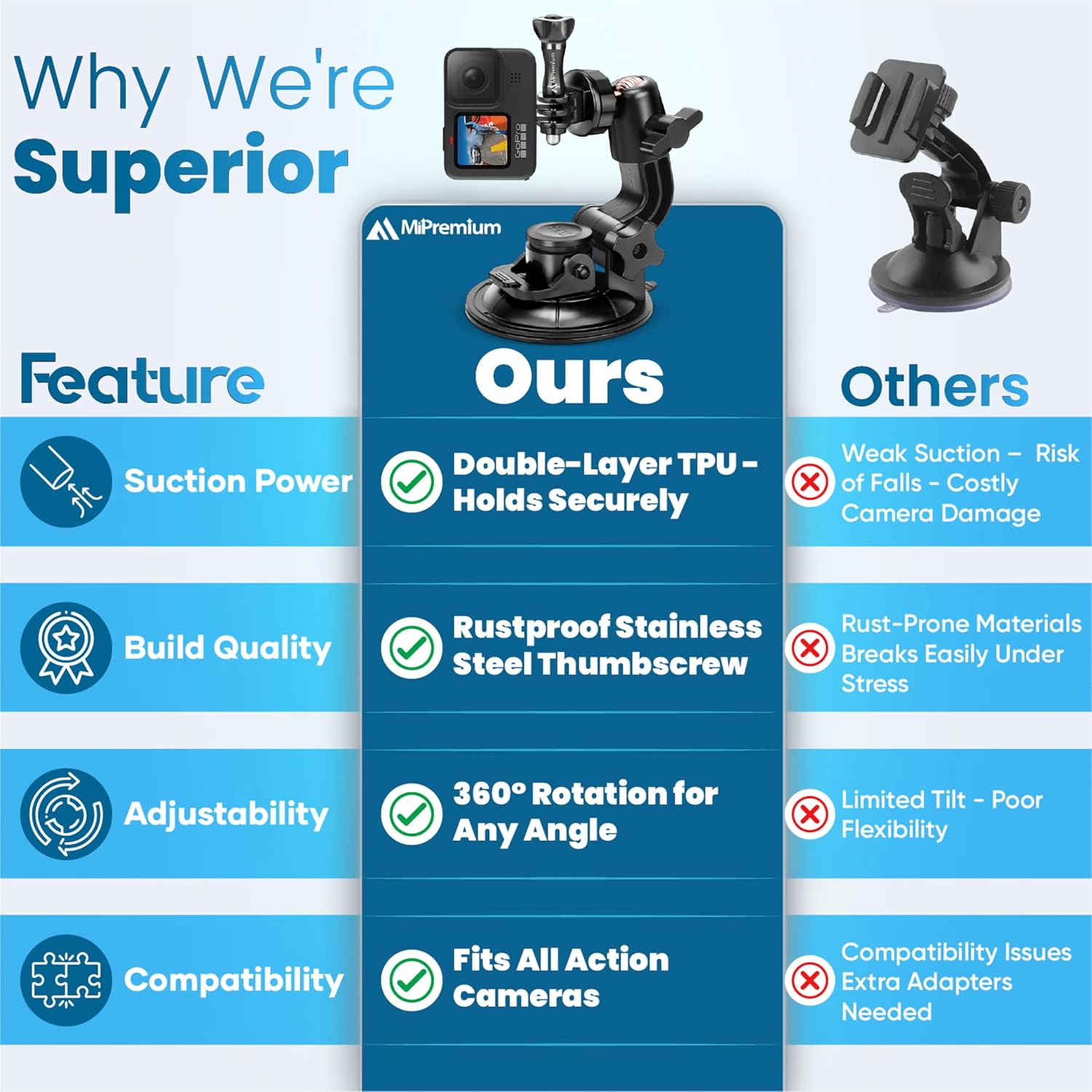 - Do not break another action camera: Designed to keep your camera securely and firmly in place during your thrilling rides. MiPremium Suction cup camera mount comes with a 3.5"/90mm suction cup area which is made of two layer TPU to offer great powerful suction capacity. Stick our dashcam mount on windscreens, glassware, window, dashboard, even car bonnet and any other smooth surfaces – making it a perfect suction mount for Go Pro & other action cameras.