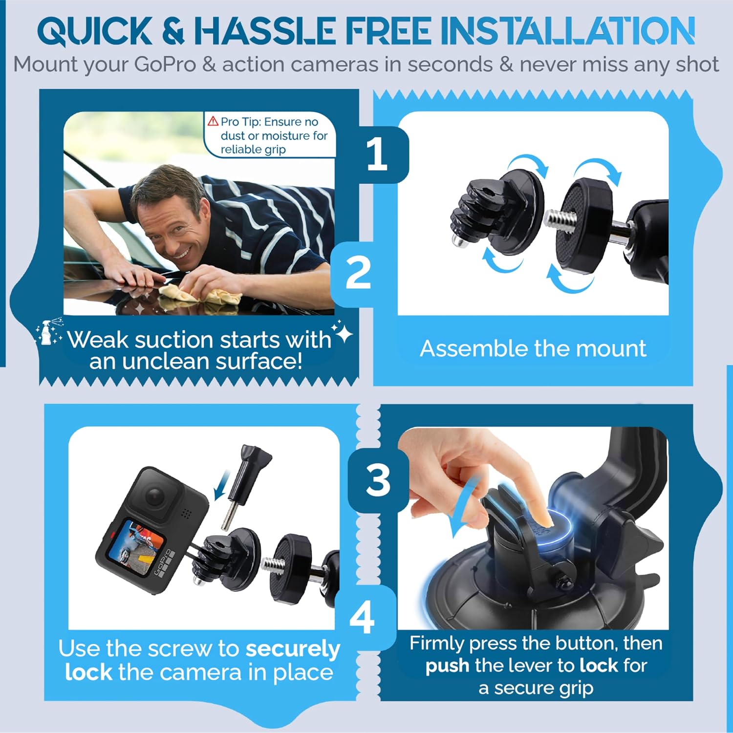 - Adjustable at every joint - get flexible 180 degree rotations & tilts for perfect angle: You should not have to restrict your angle, the adjustable joints and arms of our suction cup mount enables you to lock your go pro camera at the best visual angle and capture your best shots.