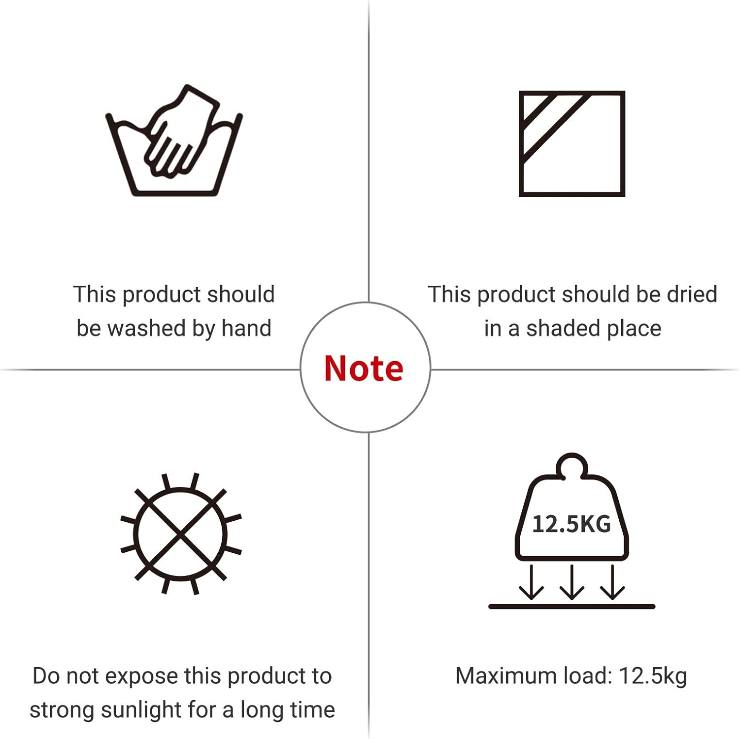 - Note: 1. Safety load: 12.5kg. 2. Do not expose to the sun. 3. Wash by hand and dry in a cool and ventilated place.