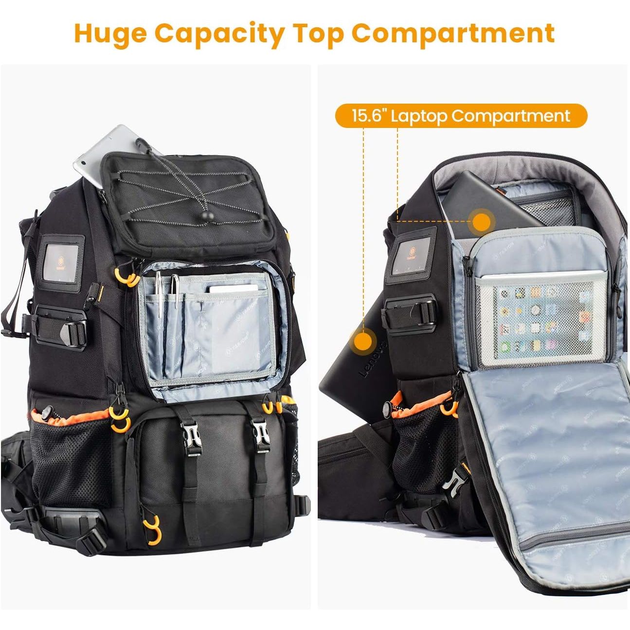 - 【Considerate Design】Max 15.6" Laptop Compartment with side zipper can be side accessed. Tripod buckle straps on both sides. Accessories pouches for small devices. Rain Cover attached.