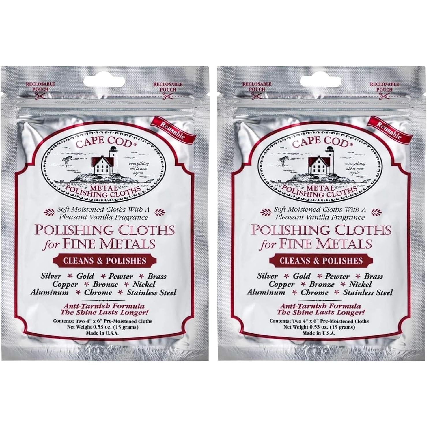 Cape Cod Metal Polishing Cloths are soft, reusable cotton cloths containing just the right amount of our amazing metal polish. Simply wipe away tarnish to reveal a mirror like shine. Never again will you need a separate silver polish, brass polish, copper polish, etc. Cape Cod Polishing Cloths work on all fine metals. Safe and easy to use, our metal polishing cloths have a pleasant fragrance and leave a revolutionary anti-tarnish finish.