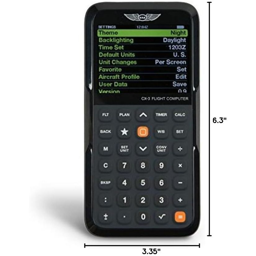 The CX-3 Flight Computer makes flight planning simple by taking confusion out of the equation. Fast, versatile and easy to use, the CX-3 delivers accurate results quickly and efficiently. It can be used on all FAA and Canadian pilot, mechanic, and dispatcher knowledge exams. Whether used for flight planning, ground school, or knowlledge testing, the menu organization reflects the order in which a flight is normally planned and executed, resulting in a natural flow from one function to the next with a minimum of keystrokes.Multiple aviation functions can be performed on the CX-3 flight computer including those related to time, speed, distance, heading, wind, fuel, altitude, cloud base, standard atmosphere, glide, climb & descent, weight & balance, as well as a holding pattern function to help determine entry method and holding details. A calculator, clock, timer and stopwatch are also built in along with mutliple settings for lighting, backlighting, themes, scrolling speed, time zones and more.The sleek design, and ergonomic fit and finish of the CX-3 make for easy transport. The protective cover comes off the front and snaps onto the back of the computer. A no-slip-strip prevents the CX-3 from sliding around on smooth desk surfaces. A Theme feature provides a convenient way to switch from Standard view to Night or Daylight views. The backlighting feature controls the brightness or intensity of the screen, and the buttons on the keypad will light up in Dusk and Night modes for use in darker environments. A Favorite feature provides quick access to your most frequently used function and store the Aircraft Profile will let you store numbers specific to your aircraft.Package includes CX-3 Flight Computer, 4 AAA batteries, protective cover, and quick start guide.