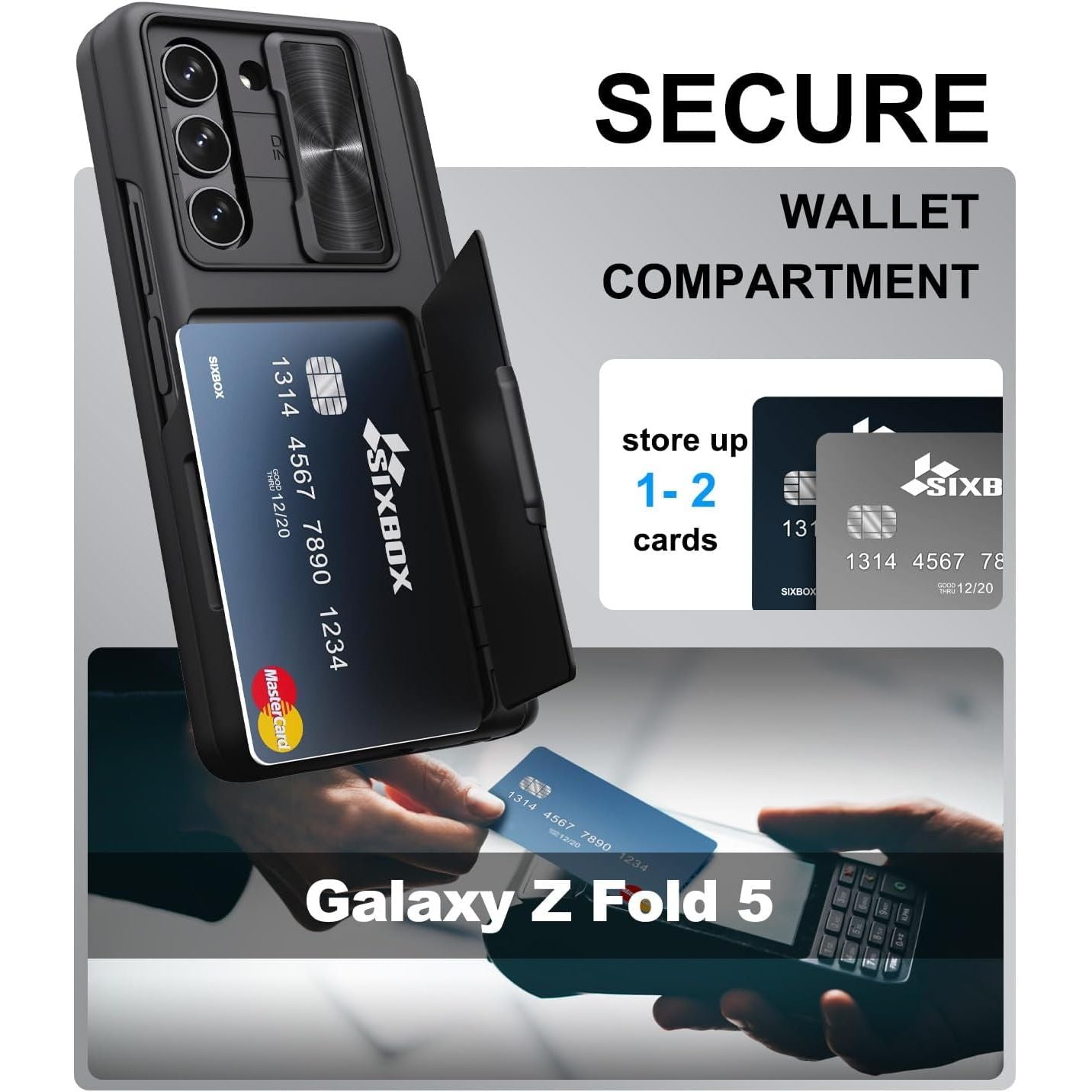 - ✅[Secure Card Holder Storage Design] This Samsung Galaxy Z Fold 5 wallet case comes with a hidden card holder which can store up to 2 cards. The clasp-type card slot structure makes everything safer. You can put your ID card, bank card, driving license, or some cash. Just take the SIXBOX Z Fold5 wallet case when shopping or traveling and say " NO" to the original bulky wallet.