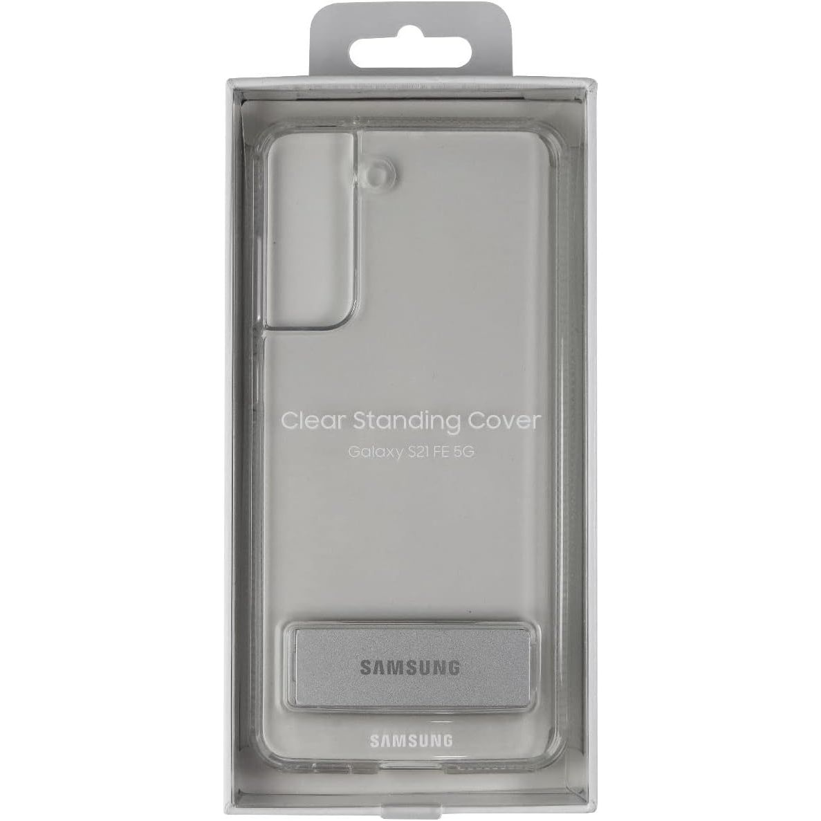 SAMSUNG Galaxy S21 FE 5G Clear Standing Cover† is a protective phone case made of two materials that ramp up its protection. A shockproof TPU (thermoplastic polyurethane) bumper wraps around the corners of your phone, and the mobile's back is protected from damage with a layer of PC (polycarbonate) ¹. Show off your chosen phone color. Transparent material on the back showcases your Galaxy S21 FE’s sleek design and bold color. And the pattern on the sides enhances the design and makes your grip more comfortable. Prop up your smartphone to standing on its own, so you can watch videos or make video calls, while keeping your hands free. On the back of the case is a Free Stop Hinge, which can be easily adjusted to your choice of viewing angles. † Remove the cover for optimal Wireless Power Share results. ¹Tested to MIL-STD-810G Transit Drop standards, for drops from a height of 1.5 meters to a steel surface, in temperatures between 15ºC to 35ºC with 0–80% relative humidity. Standard is according to accredited test results; performance may vary depending on actual usage conditions and other factors. CAUTION! To avoid electric shock and damaging your device, do not charge it while it is wet or near liquids. Do not handle device, charger or cords with wet hands.