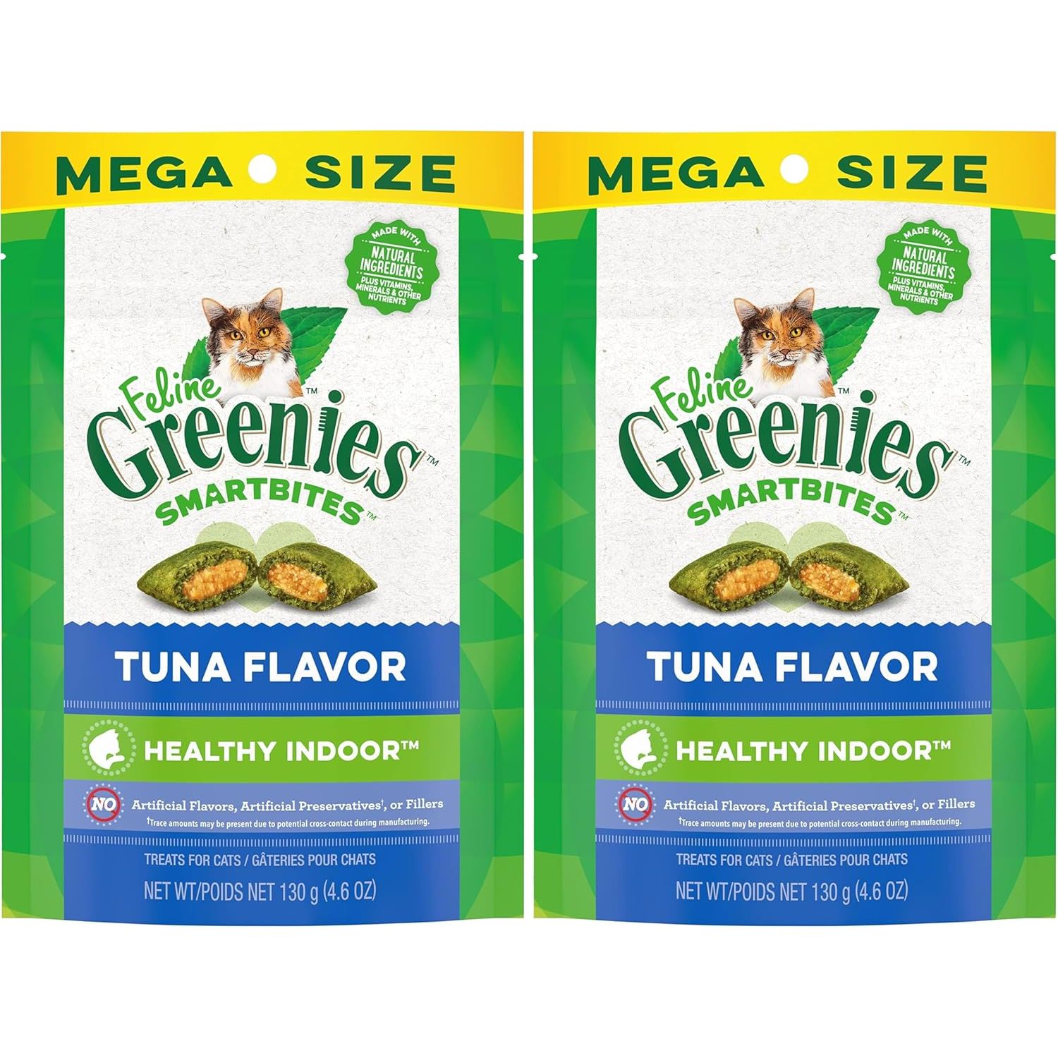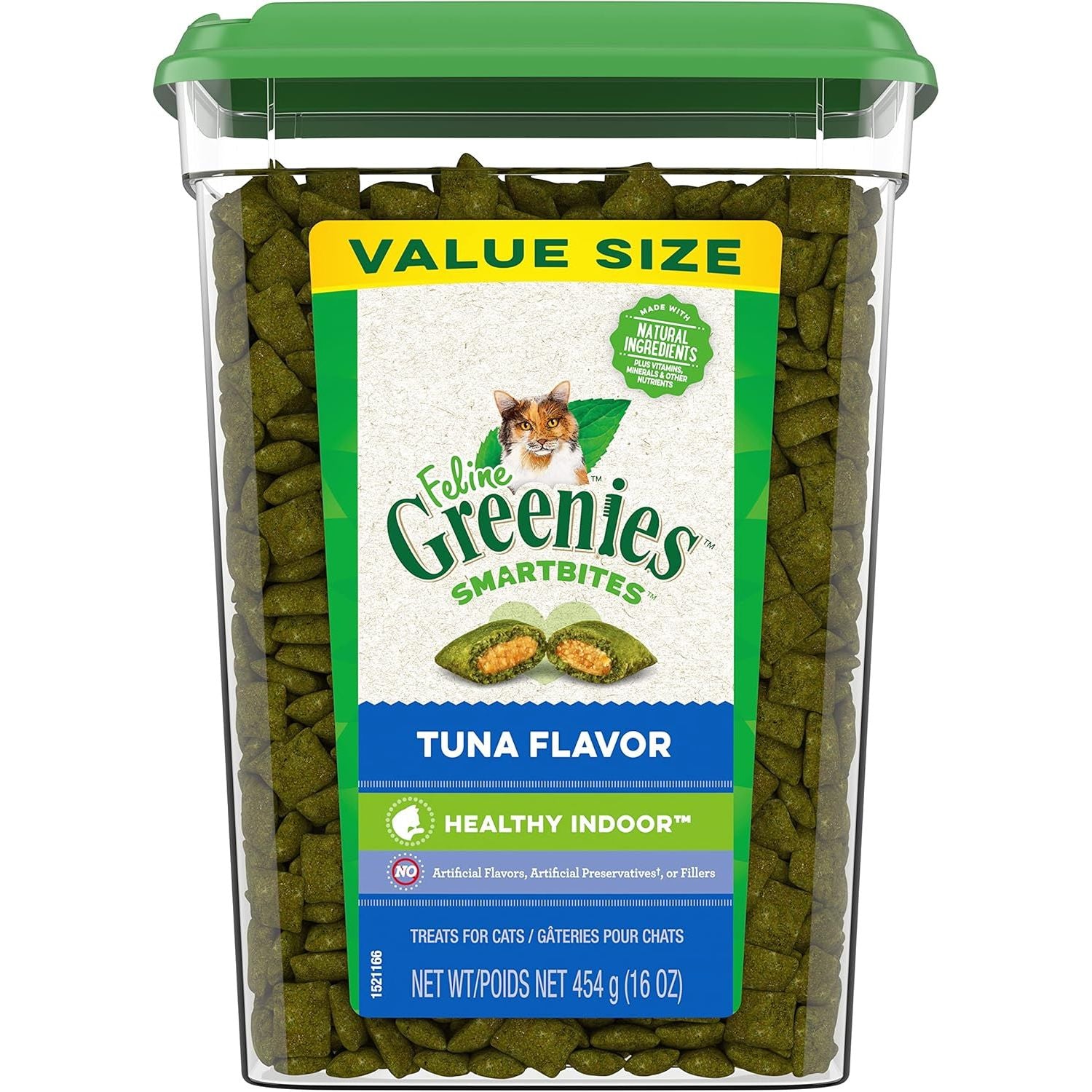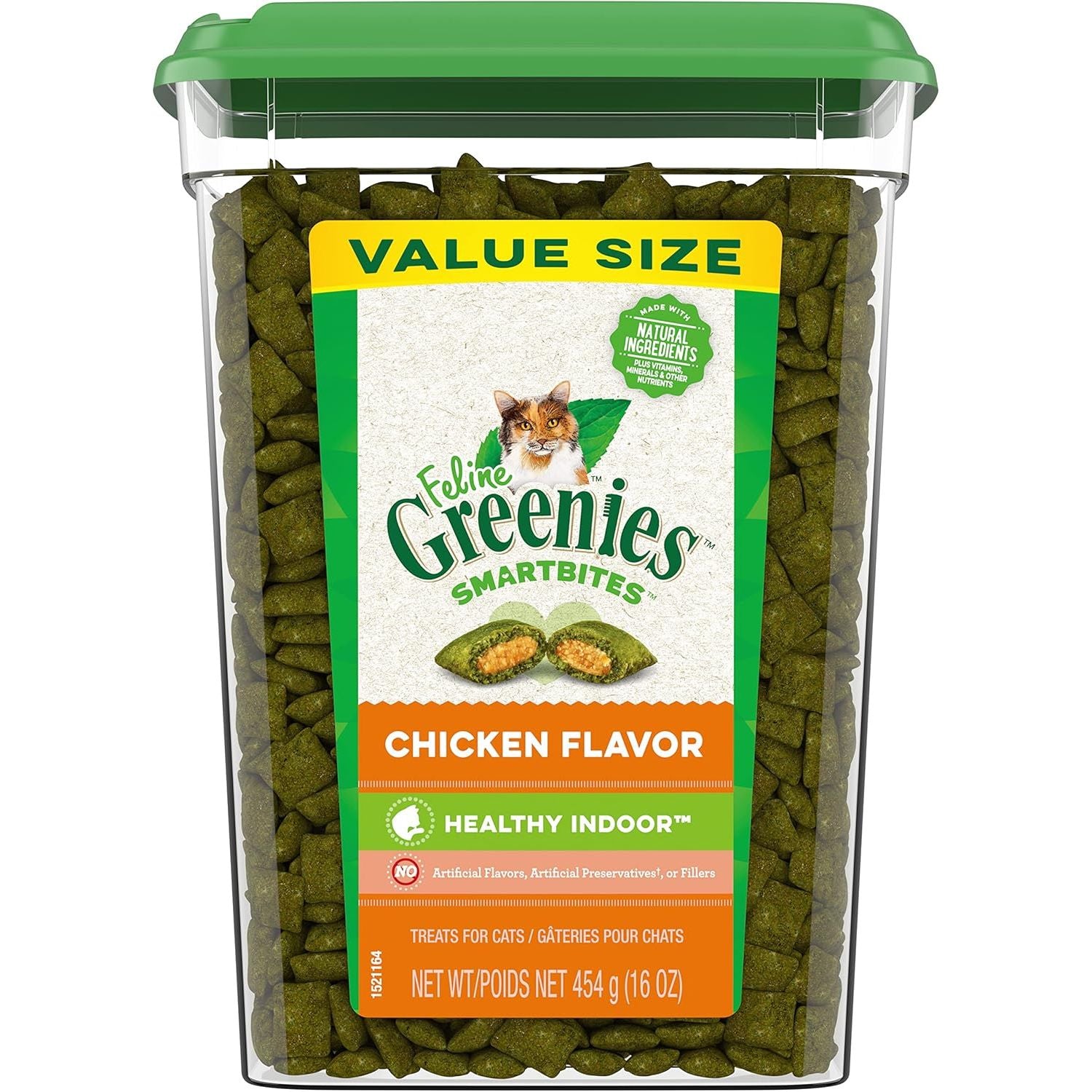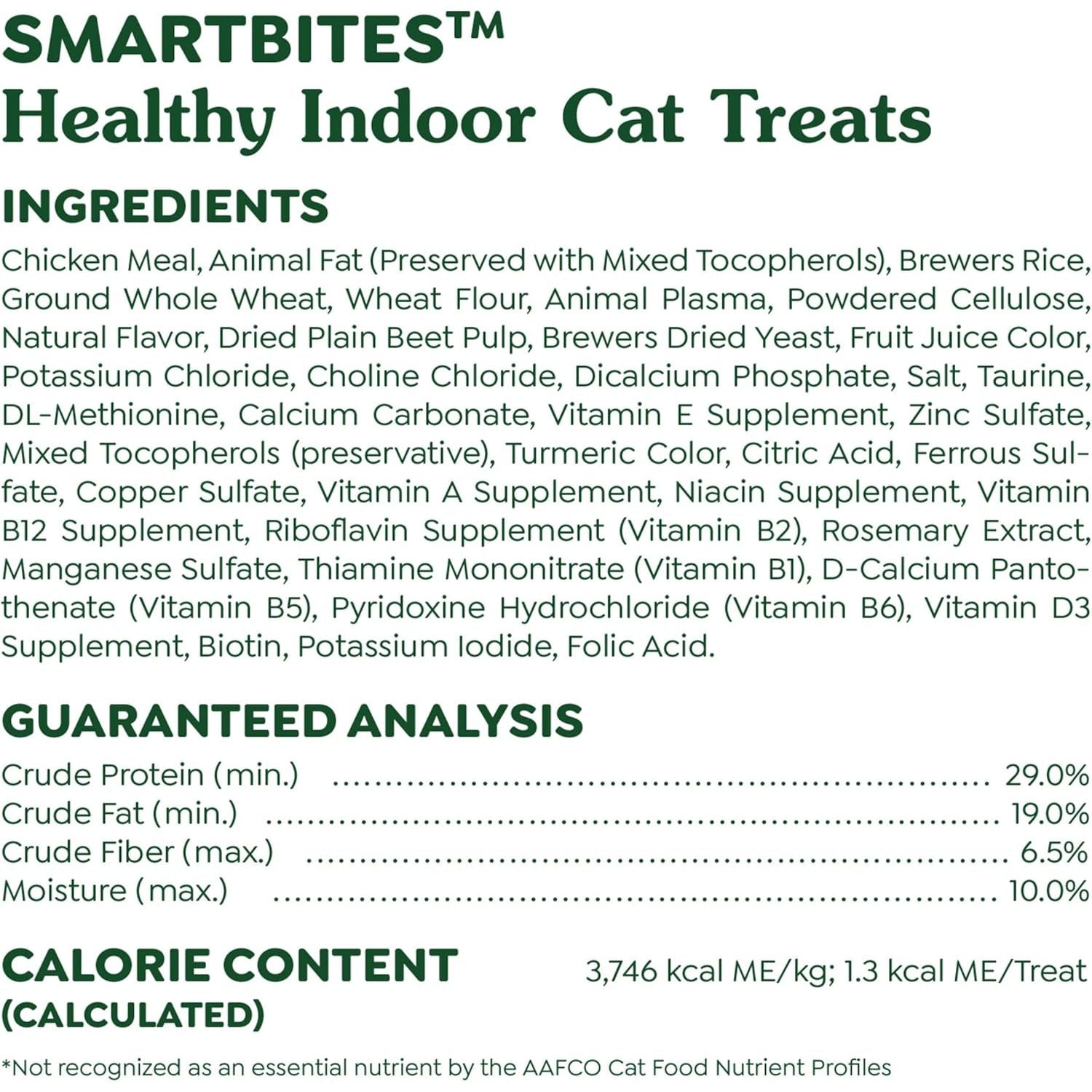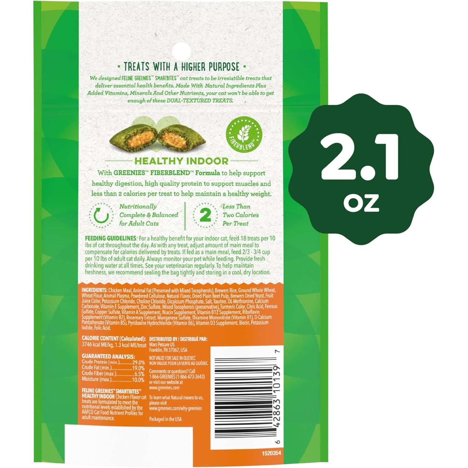 Feline Greenies Smartbites Healthy Indoor Treats for Cats are the perfect treat to keep your cat purring all day long. Created with Greenies Fiberblend Formula, these treats help support healthy digestion, have high quality protein to support muscles, and at less than 2 calories per treat help your cat maintain a healthy weight. These Smartbites treats feature a mix of crunchy and creamy textures as well as added vitamins, minerals, and other nutrients for a nutritionally complete and balanced snack. Plus, these irresistible little treats come in a delectable chicken flavor and are Made with natural ingredients, plus vitamins. They're also the perfect sized treats for cat toys... try placing a few inside a treat dispenser toy and watch your cat chase and swat away! These Feline Greenies are the healthy, tasty treats your cat will love!