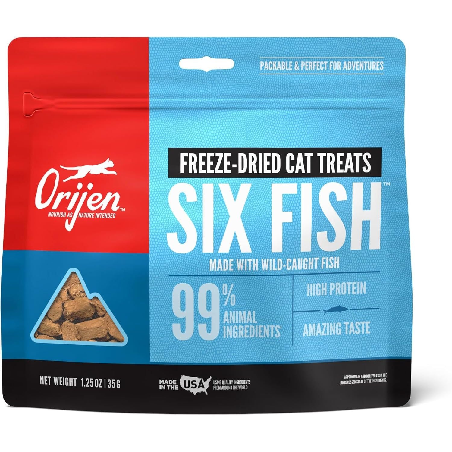 Treat your cat to nutritious and delicious ORIJEN Six Fish Freeze Dried Cat Treats. These grain free cat treats are freeze dried to lock in their nutrients and the rich, delicious goodness for a pure and tasty treat your cat will love, making them packable and perfect for adventure. Packed with animal protein, this ORIJEN cat treat recipe is made with 99 percent* quality animal ingredients, including a variety of nourishing wild-caught fish. WholePrey ingredients in these ORIJEN cat treats include the most nutrient-dense, succulent parts of the prey to deliver the nutrition cats need. At just one calorie each, these high protein cat treats are great for training or rewarding your cat with a treat that's loaded with protein and amazing taste. Nourish as Nature Intended. *Approximate and derived from the unprocessed state of the ingredients