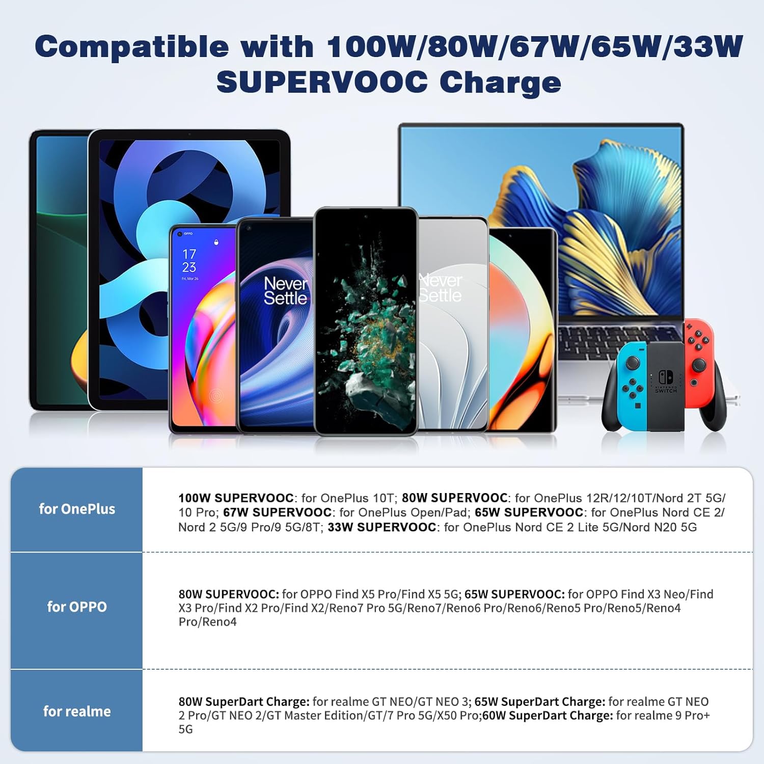 - for Supervooc Car Charger for OnePlus : This USB Car Charger supports QC/AFC/FCP/VOOC/Dart charging protocols, so you can charge your phone, tablets, laptops, portable devices etc. This usb car charger supports 100 W Max, supports 100W charge for OnePlus 13/10T, 80W charger for OnePlus 13R/12R/12/11/10 Pro/Nord 2T, support 67W for OnePlus Open/ Pad, supports 65 W Warp Charger for OnePlus Nord 2 5G/9 Pro 5G/9 5G/8T; 50W fast charging for OnePlus Nord N30 5G, 33W fast charger for OnePlus Nord N300 5G/Nord N20 5G, supports 30 W Warp Charger for OnePlus Nord/8 Pro/8/7T Pro/7T/7 Pro