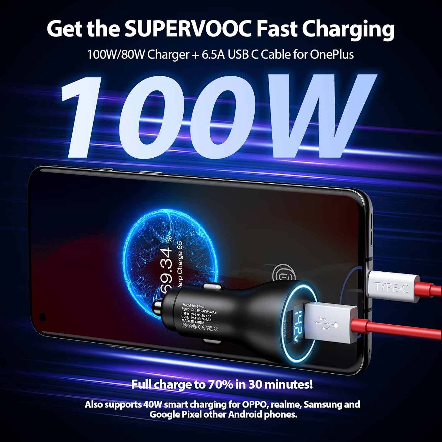 - Car Charger for SuperVOOC 100W 80W for OnePlus 13 13R 12R 12 11 10t 10 Pro, 65W Warp Charger for OnePlus Nord N30 N100 Open Pad 9 Pro 8 7T 6T 6 LED Display Dual USB Car Charge Adapter 3.3FT Fast Cable