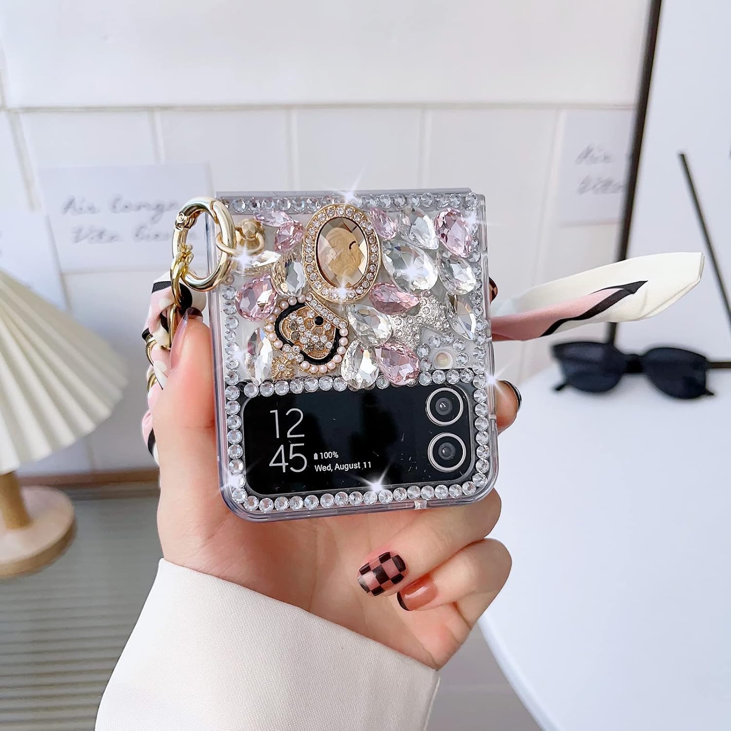 - Omio for Samsung Galaxy Z Flip 4 Bling Case with Hand Chain Wrist Strap Bracelet Silk Scarf for Girls Women Sparkle Rhinestone Pearl Crystal Glitter Diamond Shockproof Cover for Galaxy Z Flip 4 Pink