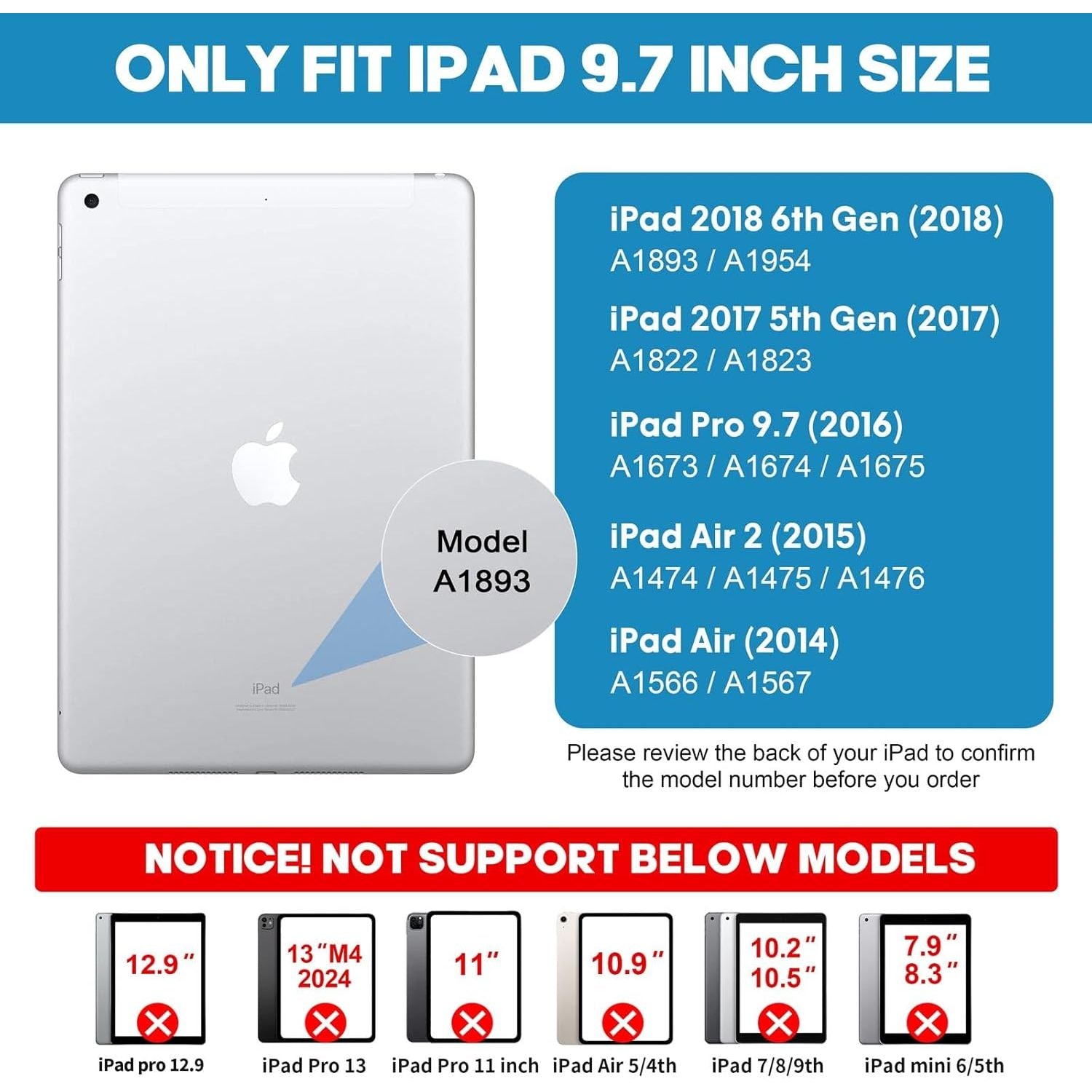 - COMPATIBILITY - This iPad keyboard case is ONLY for 9.7 inch iPad 6th Gen 2018 (A1893/A1954), iPad 5th Gen 2017 (A1822/A1823), iPad Pro 9. 7 inch 2016 (A1673/A1674/A1675), iPad Air 2 (A1566/A1567) and iPad Air (A1474/A1475/A1476). Pls check the model number on your iPad’s back(iPad is not included)