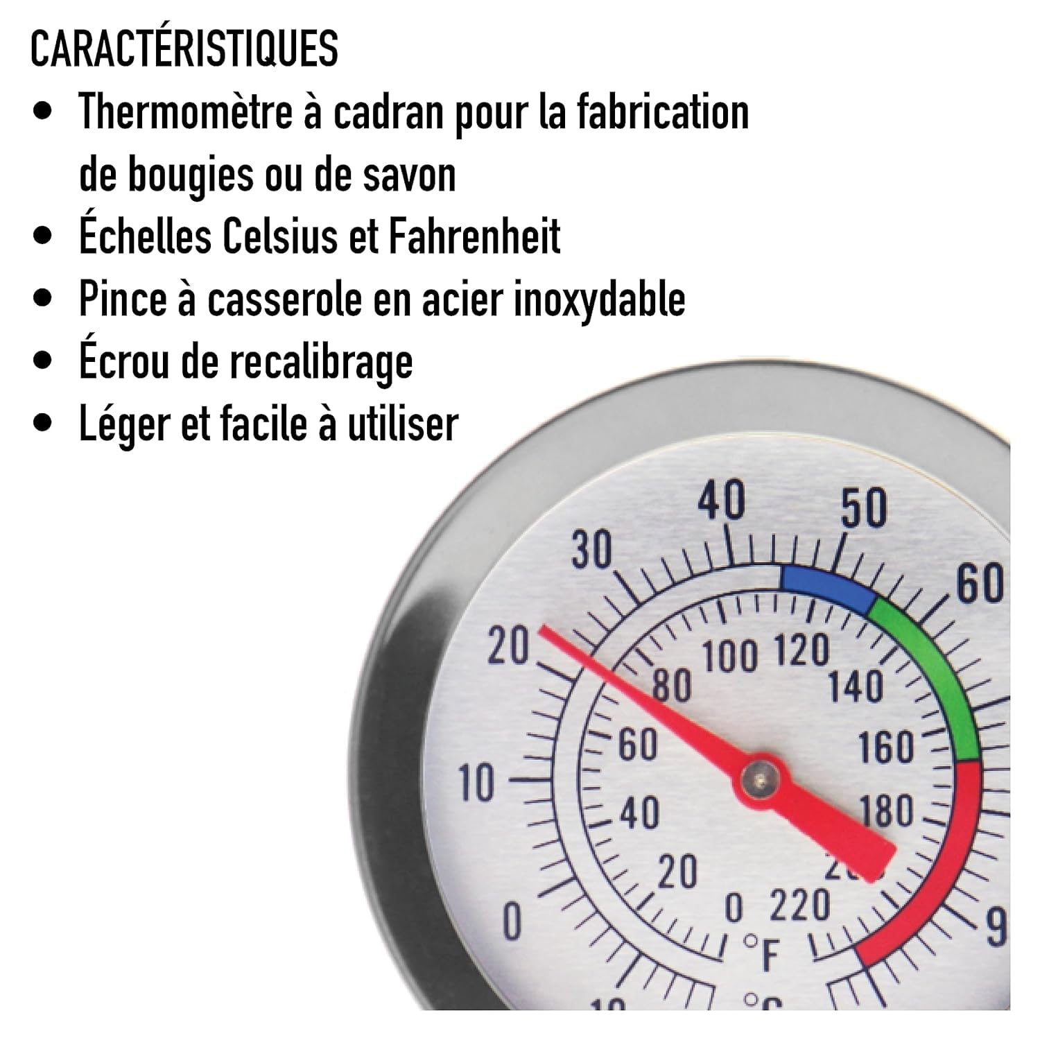 Candle Thermometer for Candle Making - DIY Wax Candle Making Supplies - Ideal Candle Making Thermometer with Clip and 300mm Stainless Steel Probe The perfect candle making thermometer for candle makers - Making sure the candle wax is not too hot or cold is critical to get the best surface for making homemade candles and soap. This candle wax thermometer has an easy to read temperature dial with a 300 mm stainless steel probe and a clip to fix to the side of a wax melting jug or pan which can be raised or lowered depending on the depth of the vessel. Candle Thermometer Specification 300 mm stainless steel probe length Temperature Range: -18 to 104 C&F Attachment Clip for Pan Easy to Use and Clean