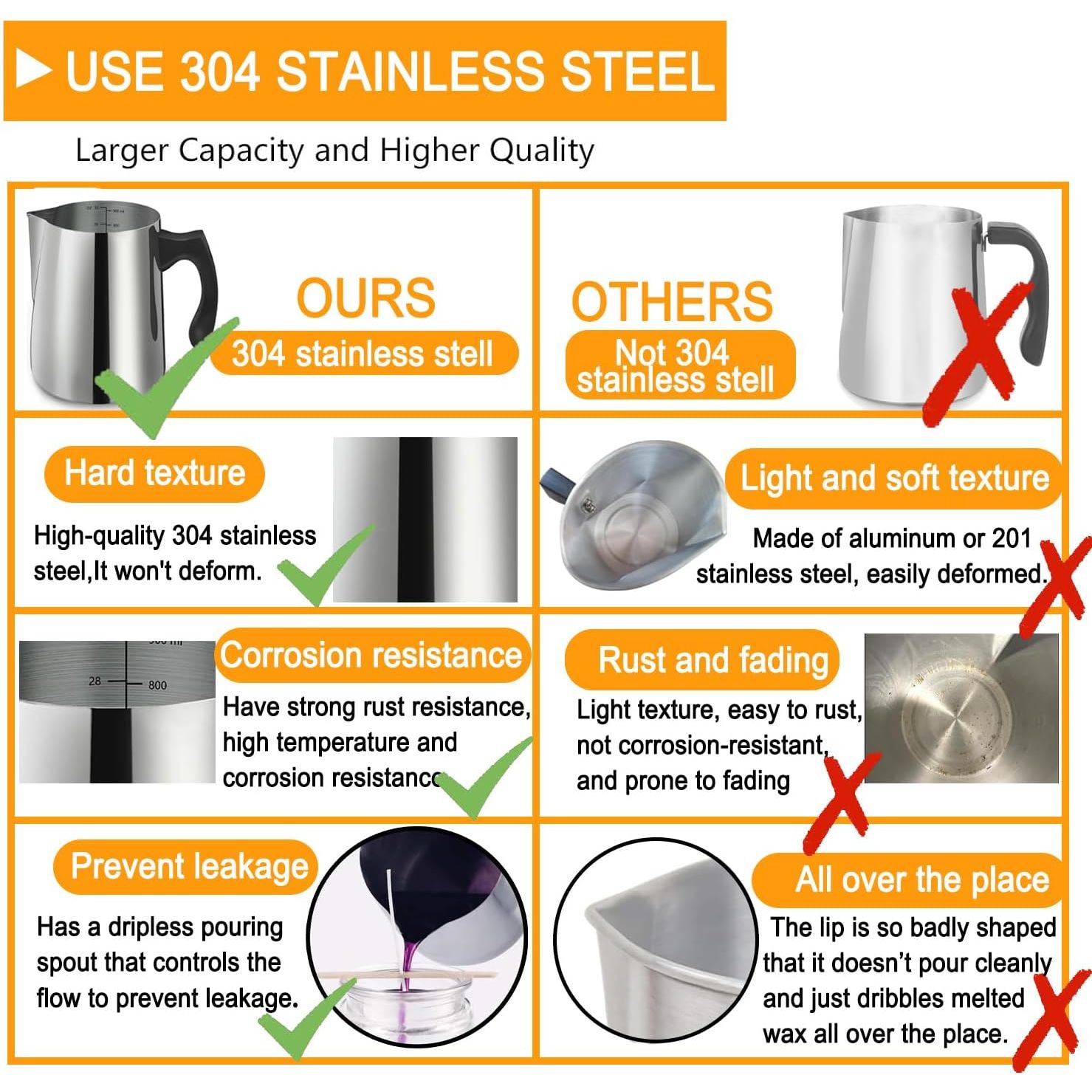 Dripless pouring spout: The unique pouring spout design allows you to better control the flow rate of melting wax when candle making use the wax pitcher, so that it does not overflow or leak.
