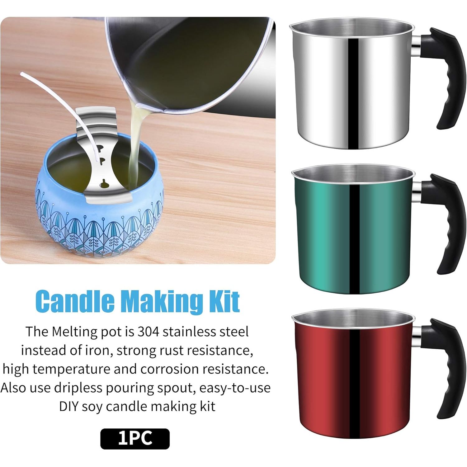 - 🔹 Higher Quality: The melting pot is made of high quality 304 stainless steel and with thickened cup wall, so it has strong rust resistance and high temperature resistance. And it has a dripless pouring spout that controls the flow to prevent leakage.