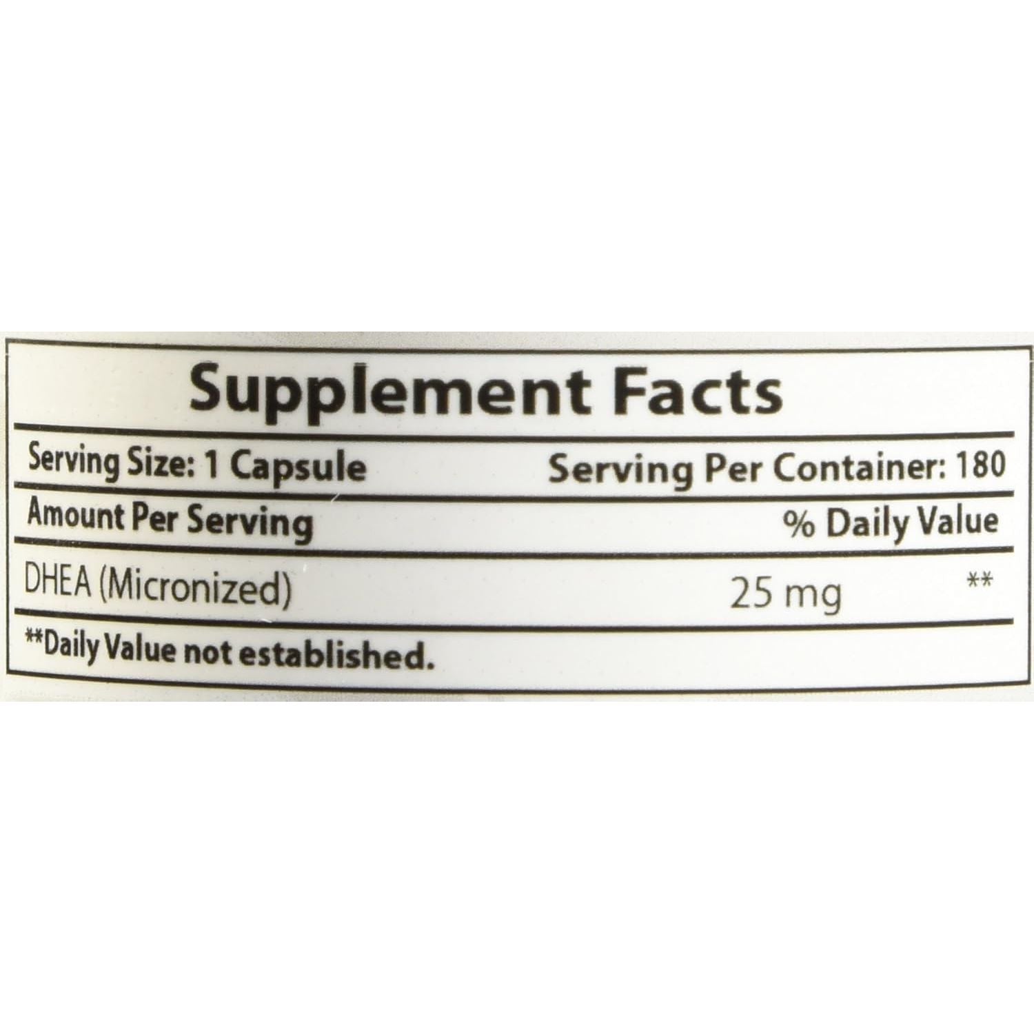 - 25 mg of DHEA (Micronized) per Capsule - 180 Capsules per Bottle.