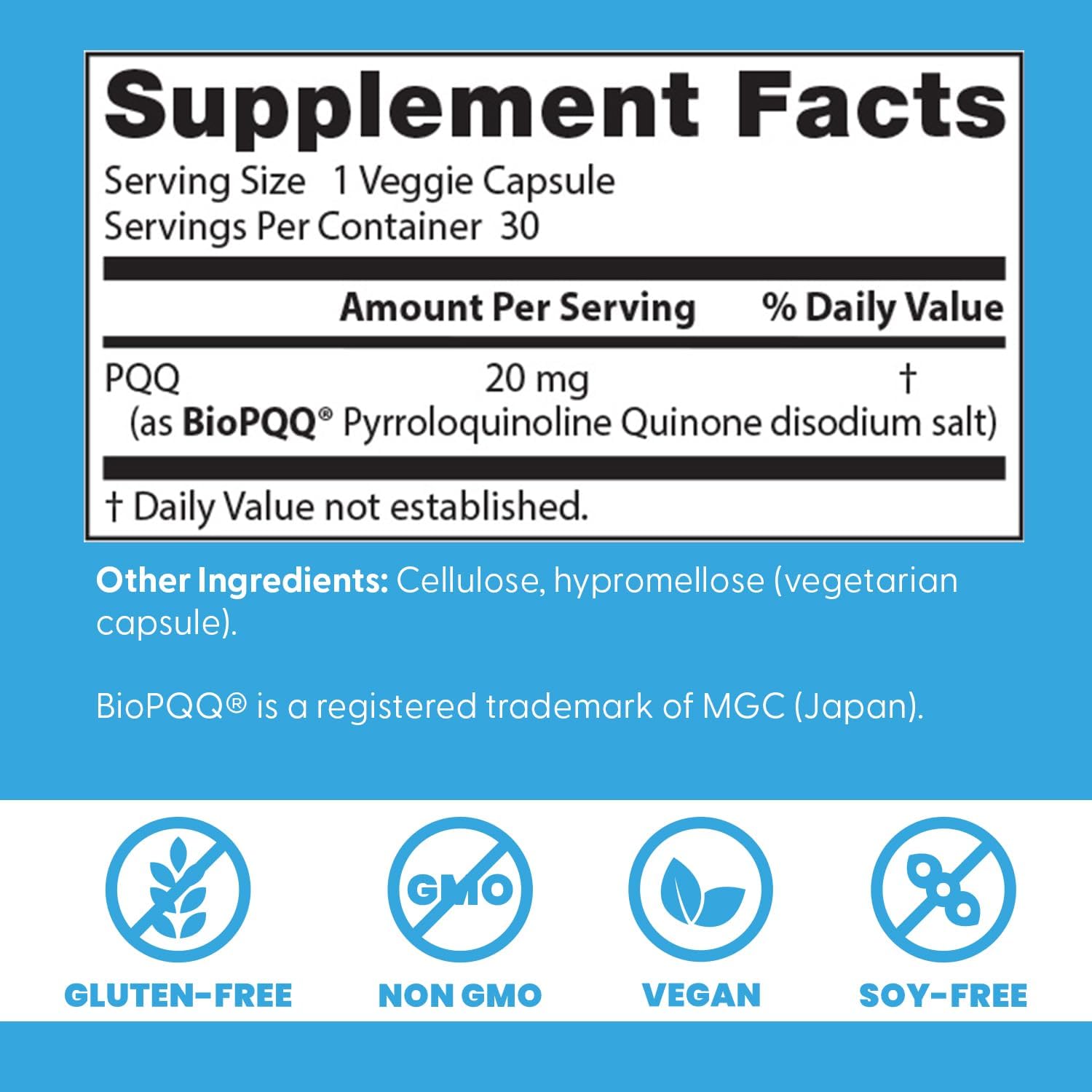 - MITOCHONDRIAL, HEART & BRAIN HEALTH - PQQ can be taken daily to support cellular energy and overall mitochondrial health.* PQQ helps the body support cardiovascular health and cellular energy *