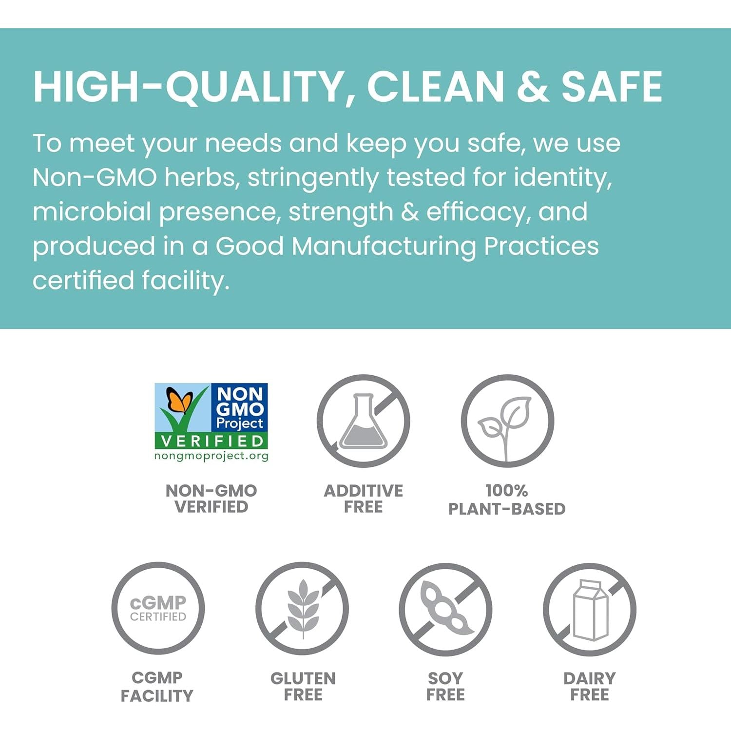 No gluten, dairy, soy, corn, or nuts. No animal gelatin.